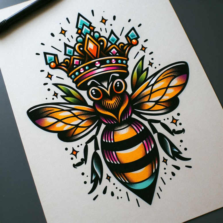 Rendered in a neo-traditional idiom, this design presents a stylized bee wearing a jewel-toned crown, wings spread wide, and a body striped in bold black and vivid orange, teal, and magenta accents. Crisp black outlines frame each element, while subtle shading provides dimension and a tactile sense of volume. The crown is embellished with geometric gems and decorative filigree, echoing pattern work that repeats across the wings and body to create a cohesive motif. The bee’s large round eyes convey a playful, almost cartoonish character that still reads as bold tattoo art. The symbolism is straightforward: the bee stands for industriousness and community, while the crown suggests leadership and distinction. The color palette is tuned for a high-contrast, color-saturated tattoo design, translating well onto skin as a lively centerpiece or a dynamic complement to other pieces. The design embraces the current interest in full-color body art, offering an option for a small or medium-sized tattoo on the forearm, calf, or shoulder. While not strictly a botanical representation, the pattern-like repetition in the wings and crown lends a decorative quality that can pair with floral motifs or script for a meaningful tattoo. For those seeking a custom tattoo design, this concept can be adjusted in scale, color, or line weight while preserving the bold silhouette and graphic appeal of traditional tattoo aesthetics. If a client desires a cover-up, this bright, pattern-rich composition can be layered over older markings to achieve a fresh, vibrant result; the structure of the bee and crown provides strong lines that can obscure problematic areas. The image reflects an AI-generated tattoo project concept, showcasing modern, vibrant tattoo ideas and illustrating how AI-assisted ideation can inspire unique body art concepts.