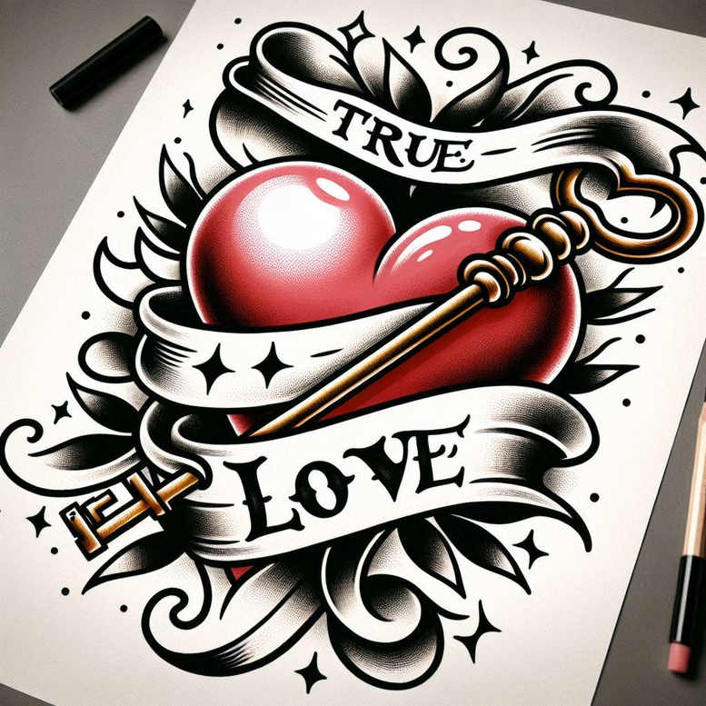 This is an AI-generated tattoo project concept presented as a color illustration of a red heart pierced by a dagger, with a white ribbon wrapping around the blade and bearing the words TRUE and LOVE. The composition is anchored by bold, black-outlined forms and generous shading that gives the heart a glossy volume while the dagger and ribbon read clearly at a distance. Decorative swirls, star accents, and trailing ribbons create a graphic pattern that frames the central motif, evoking a traditional tattoo aesthetic while staying vibrant and modern in execution. The heart conveys passion and vitality; the dagger implies sacrifice, protection, and the complexity of love; the banners act as a textual frame to emphasize the message of true love. The color palette relies on saturated red for the heart, metallic gold for the dagger, and stark white with black edges for the ribbons against a clean canvas, allowing high contrast on skin and ensuring legibility when scaled. The linework is crisp with solid black outlines, while gradient shading on the heart and blade suggests curvature and dimensionality; the ribbon folds create dynamic movement and guide the eye around the composition, and the surrounding stars and flourishes supply a timeless tattoo-pattern atmosphere without overpowering the main image. This concept translates well into a full-color tattoo, suitable for placements such as shoulder, chest, or forearm, with flexibility to adjust line weight for a slightly more traditional or a more contemporary look. For collectors of meaningful tattoos, the ‘true love’ motif offers a straightforward narrative about devotion and resilience, and the combination of iconic imagery makes it easily recognizable even at smaller sizes. As an AI-generated tattoo project concept, it demonstrates how digital illustration can inform and inspire traditional body art, inviting customization in text, color saturation, and line weight to suit individual preferences and sleeve or back-piece designs, while preserving the bold readability that makes a striking tattoo even from afar.