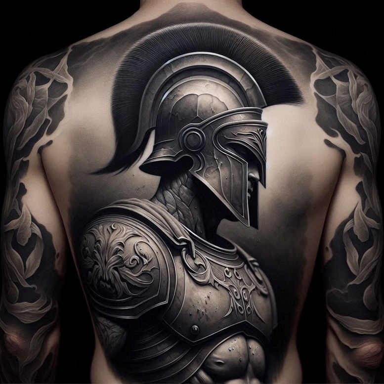 This piece is a high-detail black-and-grey realism study of a Spartan helmet set over ornate torso armor. The helmet features a pronounced crest, vented visor, and sculpted cheek guards, while the cuirass displays scrolling patternwork that evokes classical relief sculpture. Rich gradients transition from deep blacks to cool midtones, with crisp edge work and subtle micro-scratches suggesting aged metal. The composition traces the back and shoulders, using negative space to balance the focal helmet against dense armor. The overall mood is resolute and powerful, making it an ideal candidate for a cover-up tattoo where existing ink can be concealed beneath bold shading. Ornamentation on the armor and surrounding motifs create a pattern-rich surface that rewards close inspection and integrates well with a larger sleeve. Technique-wise, the piece blends bold black mass with fine-line detail, controlled stippling in the darkest areas, and smooth gradient transitions to convey metal, skin, and lighting. This is an AI-generated tattoo project concept, illustrating how a mythic warrior can translate to modern body art while conveying protection and courage through symbol. The helmet’s symbolism denotes protection and discipline, while the armor embodies endurance; together they create a timeless statement for larger body art. The heavy shading and decorative patterning also make it suitable as a cover-up over existing ink. Keywords for discoverability include tattoo, tattoo design, meaningful tattoos, fine line tattoo, lotus flower tattoo, infinity tattoo, tribal tattoo, rose tattoo design, small tattoos, flower tattoos, custom tattoo design, Japanese style tattoo, black and grey, realistic tattoo, body art, ink.