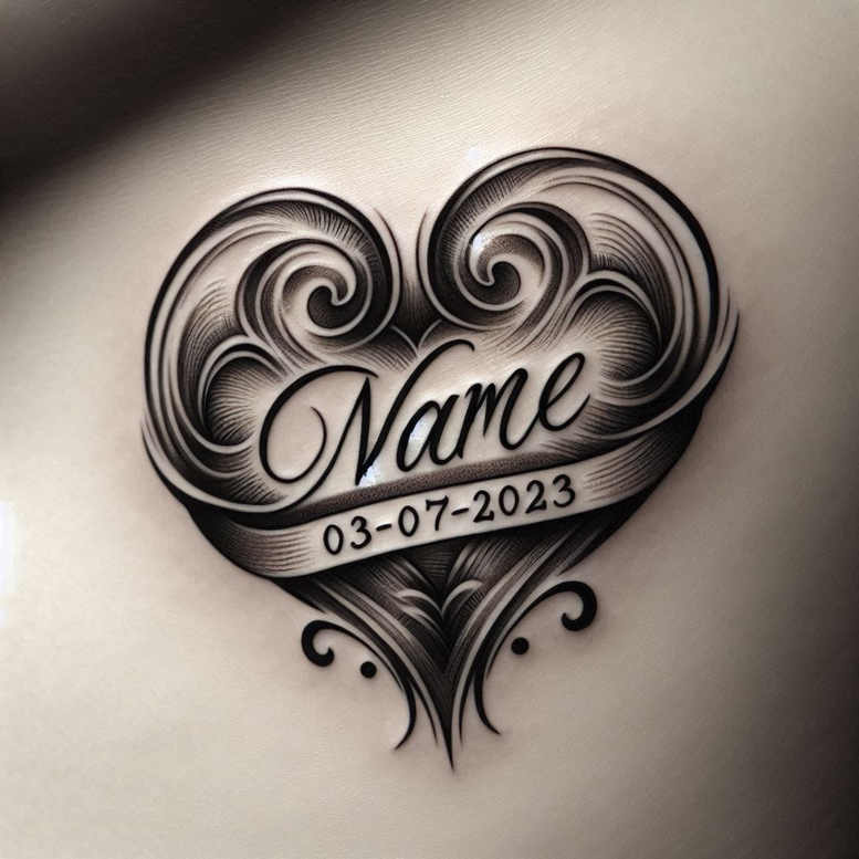 An ornate heart tattoo design rendered in black and grey, this piece centers on a heart formed by curling scrolls and filigree, a bold script name across a curved banner, and a second band bearing the date 03-07-2023. The composition is balanced and built from fine line work, smooth gradients, and deliberate negative space to deliver a refined, legible look. The banner anchors meaning: the name memorializes a person, and the date marks a meaningful moment, making this tattoo design especially suitable for commemorations. The surrounding flourishes evoke Victorian pattern work, producing a cohesive pattern that can wrap the shoulder, chest, or forearm with graceful movement. The piece relies on black and grey ink, using stippling and layering to create depth while staying timeless and adaptable for future additions. Technique emphasizes precise line control and contrast to keep the script readable on varying skin textures. Because of its dense contrast and bold shapes, this design also functions well as a cover-up option for older tattoos, with the strong black blocks capable of masking color underlayers. As an AI-generated tattoo project concept, it invites customization: change the name or date, or add floral elements while preserving the central heart motif. The concept fits tattoo design trends such as fine line, black and grey realism, ornamental blackwork, and small tattoos with personal meaning, and it scales nicely to larger pieces. In short, this is a timeless, meaningful tattoo design that blends typography and ornament into a single, versatile body art piece. Cover-up potential is highlighted for very dark applications.