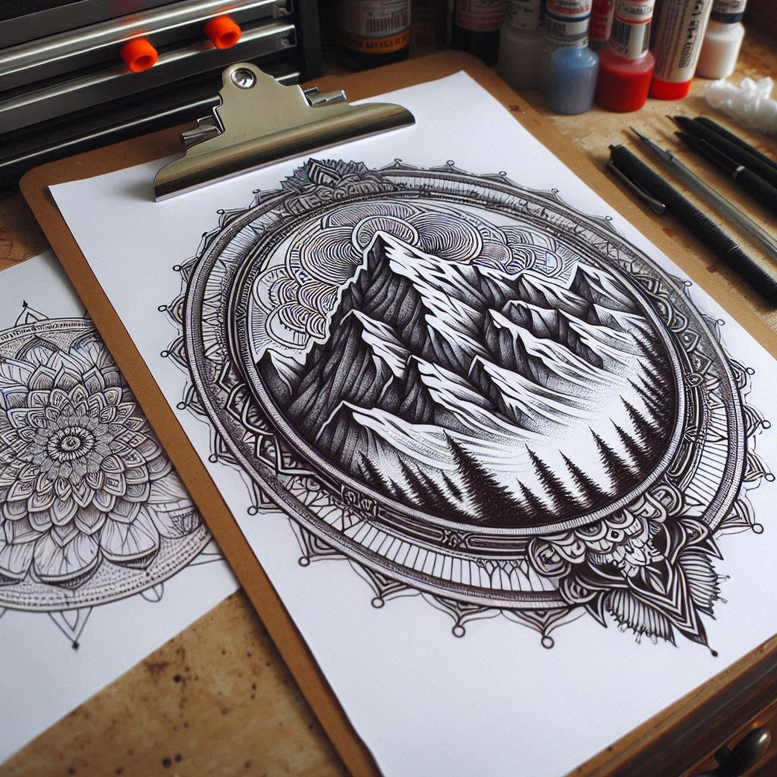 An ink study in black and grey, this tattoo design centers a jagged mountain range encased within a circular mandala. The mountains are rendered with fine-line precision; crisp outlines define each summit while subtle cross-hatching and tapering shading suggest snow, rock texture, and depth. Surrounding the landscape, the mandala grows in concentric bands of repetitive geometric petals, lace-like filigree, and dot-work details that create a hypnotic rhythm and frame the scene without crowding it. The outer edges echo a decorative border that borrows from traditional mandala and Japanese tattoo motifs, balancing bold negative space with intricate linework. The composition is versatile as a stand-alone piece on the forearm or calf, yet its pattern-rich perimeter invites expansion into a larger body-art project if the client chooses a sleeve or back piece. The black ink on white paper rendering conveys a timeless, realistic tattoo aesthetic, with the fine-line approach ensuring long-term legibility as the tattoo ages. The design plays with symbolism: mountains representing endurance and perseverance; the circle signaling wholeness and focus; the ornamental mandala expressing harmony and cycles of life. For the practitioner, this piece offers scalable elements that translate well into Japanese-style tattoo influences, geometric pattern work, or a refined tribal-inspired accent. In practice, it functions as a meaningful tattoo design that can stand alone or be integrated with lotus flower tattoo motifs, infinity symbols, or other floral elements to craft a bespoke composition. Conceived as an AI-generated tattoo project to explore crisp line fidelity and modular patterning, this study aligns with trends in fine-line tattoo aesthetics while remaining adaptable to black and grey realism, small tattoos, and bold frame work, ensuring it can be applied across varied placements with consistent ink behavior. Keywords associated with the project include tattoo, tattoo design, meaningful tattoos, fine line tattoo, lotus flower tattoo, infinity tattoo, tribal tattoo, rose tattoo design, small tattoos, flower tattoos, custom tattoo design, Japanese style tattoo, black and grey, realistic tattoo, body art, ink.