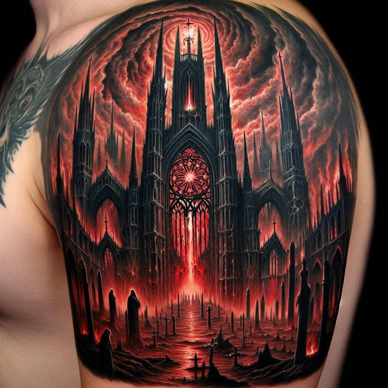 An imposing Gothic cathedral scene rendered in realistic black and grey with dramatic crimson highlights, this full-shoulder tattoo project merges architectural grandeur with a moody cemetery landscape. The design centers on a towering cathedral dominated by slender pinnacles and lancet arches that rise toward a stormy sky, its central rose window pulsing with red light as if the void itself were breathing. Surrounding ruinous fortifications, scattered graves, and weathered crosses create a graveyard tableau that travels from the lower edge up into the cathedral’s forecourt, using strong contrasts and smooth transitions to achieve depth and atmosphere. The artist uses high-contrast black ink to sculpt the architecture, delicate gradients to render red illumination, and careful negative space to suggest mist and distant horizon. Each element serves symbolic meaning: the cathedral stands for endurance and memory, the graveyard marks mortality, and the crimson glow evokes passion, danger, and transformation. While rooted in traditional Gothic imagery, the piece reads as a modern tattoo design, with the scale and composition optimized for a large canvas such as a shoulder or back. This is an AI-generated tattoo project, reflecting experimental digital ideation translated into hand-pulled ink that preserves the tactile quality of real skin. For collectors seeking meaningful tattoos, this scene offers a narrative of reverence and renewal while remaining visually cohesive and highly adaptable; it remains legible when viewed from a distance and up close, ensuring a strong silhouette and a striking focal point contributed by the rose window. Given its darkness and heavy shading, the design is inherently suitable as a cover-up, capable of masking prior ink or imperfections beneath a dramatic new upgrade. Keywords relevant to the piece include tattoo, tattoo design, meaningful tattoos, black and grey, realistic tattoo, body art, ink, rose tattoo design, and custom tattoo design; the work also nods to architectural motifs and Gothic symbolism, balancing photographic realism with fantasy mood to create a memorable and versatile piece for future sessions.