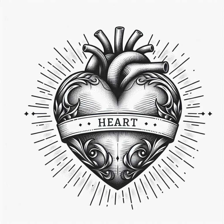 This is an AI-generated tattoo project showing a black and grey fine line heart design. The central motif is an anatomically inspired heart rendered with precise outlines and subtle shading to suggest depth without solid fills. A wide banner wraps across the midsection bearing the word HEART, anchoring the piece like a vintage emblem. Ornamental flourishes curve along the sides, following the heart’s contours, while radiating lines extend outward to give a dynamic halo and a sense of motion. The composition balances bold graphic impact with delicate detail, ensuring the piece reads clearly at small scales yet reveals intricate texture on closer inspection. The technique emphasizes clean line work, restrained shading, and generous negative space, employing stippling and cross-hatching to create tonality while preserving the crisp look of a fine line tattoo. The black and grey palette provides timeless contrast and pairs easily with other motifs such as roses, lotus flower tattoos, infinity symbols, or tribal elements when built into a larger custom tattoo design. Symbolically, the heart stands for love, courage, and resilience, while the banner invites a personal inscription, making this a meaningful tattoo concept for those seeking a small-to-medium piece with a strong graphic identity and a timeless vibe. The design nods to traditional tattoo aesthetics—bold outlines, ornamental scrollwork, and a measured composition—while embracing contemporary precision and clean execution suitable for a professional setting and long-term skin integrity. If you’re exploring cover-up options, the clear outlines and adaptive shading offer flexibility to blend with existing work while preserving the new design’s impact. In short, this tattoo design is a versatile, meaningful option for ink enthusiasts seeking a classic heart motif with decorative flair, ready for placement on the chest, shoulder, or forearm and adaptable to future expansions.