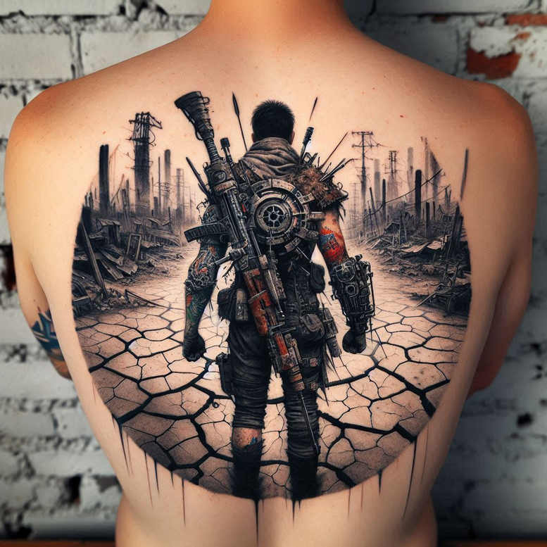 An AI-generated tattoo project that blends mythic symbolism with contemporary realism, this back piece centers a lone warrior figure whose armor bears a circular sigil reminiscent of a sacred sun. The composition rises from cracked earth, a metaphor for judgment and renewal, while a ruined city looms in the distance, suggesting the upheaval that faith can endure before redemption. The artist uses precise shading to render black and grey gradients, allowing the figure to anchor the scene with weight and gravity. The central circle motif acts as a spiritual mandala, echoing ideas of eternity, divine guidance, and Jesus as protector and king. The posture is upright and resolute, implying sacrifice, service, and steadfast faith under Christ’s leadership. The background’s jagged skyline and the fissured ground create a pattern-like texture that intensifies the overall drama without distracting from the main subject. This design embodies meaningful tattoos for someone seeking a powerful narrative on skin — a custom tattoo design that speaks of perseverance, salvation, and the eternal reign of Jesus. This piece suits both bold black and grey realism and fine line tattoo sensibilities, offering a bridge between dramatic shading and precise linework. Given its deep contrast and densely filled composition, it is particularly suitable as a cover-up for existing darker ink, because the negative space and bold shading can mask underlying tones while still delivering a striking final result. Techniques include smooth transitions between ebony blacks and graphite greys, controlled stippling for subtle texture, and careful edge work to keep the silhouette crisp against the intricate background. The piece fits well as a large back tattoo or a statement piece for those drawn to religious iconography expressed through modern realism; it also invites future embellishment around the edges if the client desires a broader narrative or additional script invoking Jesus’ name. Whether placed as a single-seat centerpiece or extended into a larger sacred landscape, the design remains faithful to traditional symbolism while embracing contemporary tattoo design trends like black and grey realism, and it underscores a message of faith, courage, and divine protection through Jesus.