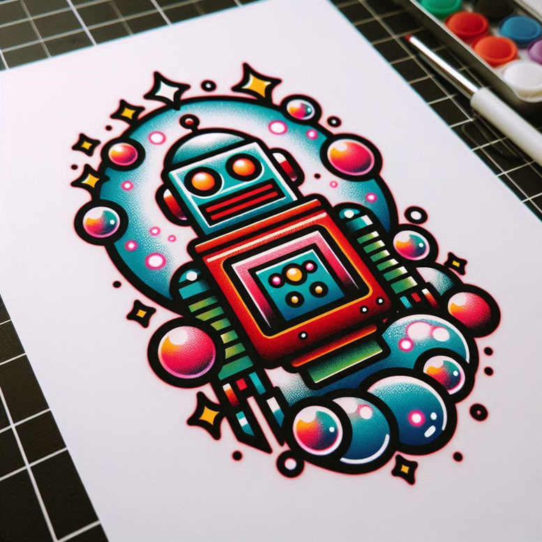 An AI-generated tattoo project presenting a vibrant cartoon robot wrapped in a ring of teal bubbles and gold-yellow stars, outlined in bold black with saturated reds, teals, and pinks. The figure leans diagonally, conveying playful motion on a clean white skin-like canvas; though this is a design concept on paper, it translates into tattoo art as a bold color piece or as a base for a larger color sleeve. The composition relies on strong color blocks and crisp line work rather than delicate fine line technique, giving it the clarity needed for a small tattoo or a larger back piece; the bubble halo acts as a dynamic aura that frames the robot and can accommodate shading, gradient fills, or texture as desired by the tattoo artist. The robot’s retro-futuristic silhouette nods to classic Japanese style tattoo motifs while the bright color palette leans into pop-art aesthetics, making it ideal for meaningful tattoos that celebrate creativity and optimism. The imagery is designed to be instantly legible at a distance, with clear contrasts between red torso, teal head, and pink accents, which helps maintain long-term readability as ink ages. For clients considering cover-up options, the solid color blocks and defined borders are advantageous for concealing previous work while preserving a vivid focal point. This project demonstrates how AI-assisted tattoo design can yield a ready-to-ink concept that blends elements from rose tattoo design, infinity tattoo, and small tattoos into a cohesive and versatile piece, while remaining adaptable to styles like black and grey or full color, depending on the client’s skin tone and personal meaning. In sum, this tattoo design emphasizes playful robotics, bubble patterns, and starry accents as a customizable body art concept that invites collaboration with a tattoo artist to tailor line weight, shading, and sizing, ensuring a unique inked interpretation of a modern, graphic robot motif. This approach reflects the growing role of AI in tattoo projects, offering a fresh pathway for meaningful tattoos and custom tattoo design that resonates with both traditional and contemporary tattoo culture, while remaining easy to adapt for a cover-up if needed.