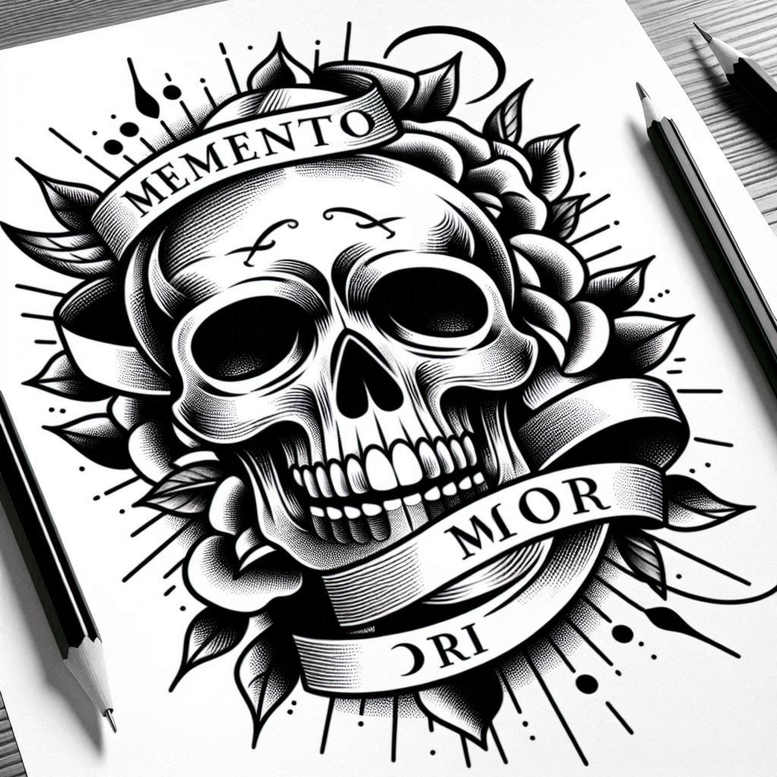 AI-generated tattoo project presents a bold black-and-grey skull centerpiece wrapped by a rose and carved ribbons in a compact circular composition. The skull is rendered with dense shading in the orbits, a gleaming row of teeth, and subtle cross-hatching that creates a sculpted, almost lithic look. A lush rose frames the cranium, its petals curling in layers and contrasting the skull’s angular geometry, while a pair of banners flows across the image with the Memento Mori inscription, a timeless motif that underlines mortality and memory. Radiating sunburst lines emerge from behind the composition, forming a graphic pattern that adds energy and movement to an otherwise static study. The pencil-sketch feel, with varied line weights and deliberate negative space, reads as a design ready for transfer to skin, while the heavy black ink shading guarantees legibility and longevity on the body. This tattoo design leans into the intersection of realism and traditional bold linework, delivering a piece that feels both classic and contemporary. Its meaning is rooted in meaningful tattoos: mortality, remembrance, and renewal, made explicit by the memento mori banner and the resilient rose motif. The piece is ideal as a cover-up due to its dense black shading capable of concealing existing marks, and its clear silhouette remains recognizable as the ink ages. Technically, the work balances fine line detailing with solid black areas, employing stippling and gradient shading to create depth, while the rose introduces organic softness that offsets the skull’s hard geometry. For clients seeking a meaningful tattoo design with a strong visual impact in black and grey, this composition offers a versatile option suitable for larger or smaller canvases, and it demonstrates the potential of custom tattoo design to blend Japanese-inspired restraint with Western traditional motifs in a body art setting. Note this is an AI-generated tattoo project, illustrating how digital concepts can inform tattoo artistry without sacrificing the tactile quality of ink, with the end result being a durable, high-contrast piece that remains legible over time.