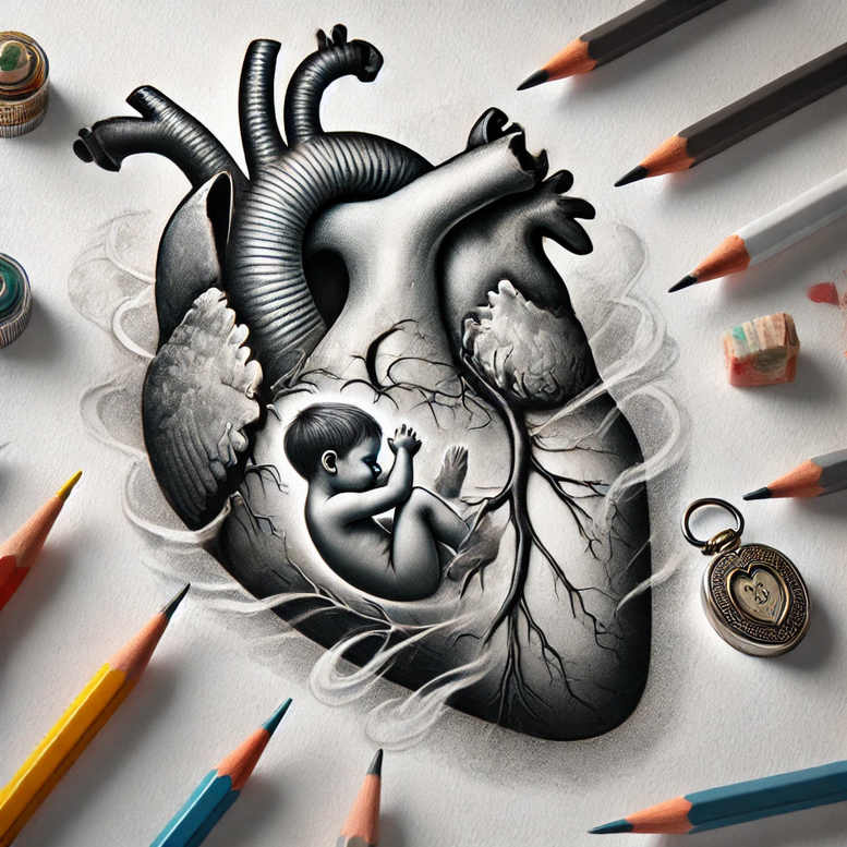 An AI-generated tattoo project rendered in grayscale, this design centers on an anatomically inspired human heart cradling a fetal form. The composition merges medical realism with intimate symbolism: the heart’s ventricles and aortic pathways wrap around a sheltered fetal silhouette, suggesting vulnerability, birth, and the cycle of life. Veins branch across the chamber, echoing tree-like root systems, while the surrounding space is filled with soft charcoal shading to create depth and atmosphere. The work includes a few pragmatic elements—pencil tips, a delicate locket resting at the periphery, and a tiny ink bottle—which reinforce the studio mood of creation and memory. The overall palette stays in black and grey, emphasizing contrasts and fine line work rather than color, which makes it ideal for a cover-up: the dark masses and shadows provide a canvas to mask prior tattoos while integrating the new design. The fetus is rendered with gentle curves and proportioned features to convey innocence and potential; the heart’s aortic arches and vascular network lend a sense of motion and vitality. This piece leverages a mix of fine line techniques and smooth shading to create a lifelike texture on skin, offering a high-contrast look that remains tasteful and meaningful. The artistic concept can be interpreted as a meditation on life, resilience, and the relationship between heart and soul. In practice, this tattoo design suits larger canvases but can be adapted to smaller areas with scaled-down line work, preserving readability of the fetus while keeping the core motif intact. Note that this is an AI-generated tattoo project, illustrating how digital concept art informs tattoo design, and the composition can be modified to suit individual anatomy and preferences, ensuring a lasting, meaningful body art piece.