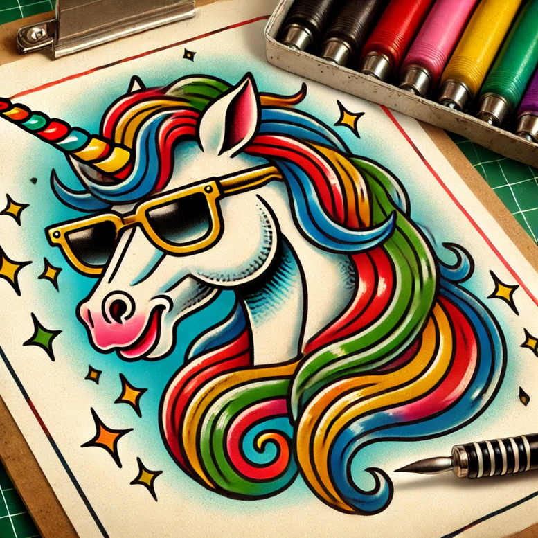 This AI-generated tattoo project presents a vivid unicorn motif rendered in bold line work and saturated color. The central figure is a unicorn head in profile, wearing oversized sunglasses, with a flowing rainbow mane that cascades through red, orange, yellow, green, blue, and violet. The horn is striped with warm tones and a subtle highlight, while small stars orbit the head to create movement and whimsy. The piece uses high-contrast outlines and solid color fills, balancing classic tattoo design with a contemporary pop-art edge. The style sits at the crossroads of fine line tattoo and bold illustration, making it versatile for placements from the shoulder to the calf. The rainbow palette is vibrant yet harmonious, designed to age well while remaining legible at small sizes. Symbolically, the unicorn evokes magic, individuality, and freedom, while the sunglasses inject humor and attitude, inviting playful interpretations of identity in a modern, fashion-forward context. The star motifs and the segmented mane hint at graphic patterning, which could translate into a pattern-driven sleeve or back-piece if desired. For clients seeking smaller works, the concept can be distilled into a compact version without losing its character. This concept demonstrates how a bright, graphic unicorn can function as a memorable tattoo design with broad appeal, and it can be adapted into Japanese-style or black-and-grey renditions if requested. As an AI-generated tattoo project, it offers a ready reference for designers exploring cheerful, uplifting themes in ink and body art, and it engages a spectrum of tattoo keywords for search optimization: tattoo, tattoo design, meaningful tattoos, fine line tattoo, lotus flower tattoo, infinity tattoo, tribal tattoo, rose tattoo design, small tattoos, flower tattoos, custom tattoo design, Japanese style tattoo, black and grey, realistic tattoo, body art, ink.
