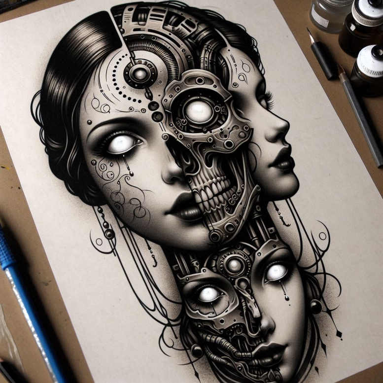 This black-and-grey tattoo design fuses portraiture with biomechanical patterning, presenting a woman’s face that dissolves into gears, cogs, and skeletal machinery. The composition uses high-contrast shading and fine line detail to render smooth skin tones beside razor-sharp metallic elements, creating a sculptural effect on the skin. The upper portrait reads as a serene gaze, while adjacent mechanical layers reveal a skull-like mask and interlocking joints, a visual metaphor for hidden identities and the convergence of humanity and machine. The repeating circular gears, riveted plates, and delicate filigree act as a rhythmical pattern across the composition, drawing the eye along the neck and temples. Executed entirely in black and grey, the piece relies on gradient shading, crisp negative space, and meticulous micro-lines to achieve depth and texture. Though intense, the design maintains readability and a refined elegance that suits both large canvases and discreet placements; its dense blacks and transitional grays make it a powerful candidate for cover-up work, capable of concealing older ink while delivering a striking, contemporary statement. This concept is an AI-generated tattoo project, illustrating how technology can inspire bold, custom tattoo design ideas that align with meaningful tattoos and modern body art. The motif nods to fine line tattoo vocabulary through its network of fine lines and micro-gear detailing, while still embracing a realistic interpretation of mechanical anatomy. The imagery sits comfortably within black and grey schemes and could be adapted into other styles, including Japanese style tattoo influences or floral designs, should a client seek a more symbolic path like a lotus flower tattoo or rose tattoo design. In sum, it blends machine-age symbolism with portraiture to offer a powerful narrative about resilience and transformation, a worthy addition to any collection of meaningful tattoos, and a flexible blueprint for future ink projects.