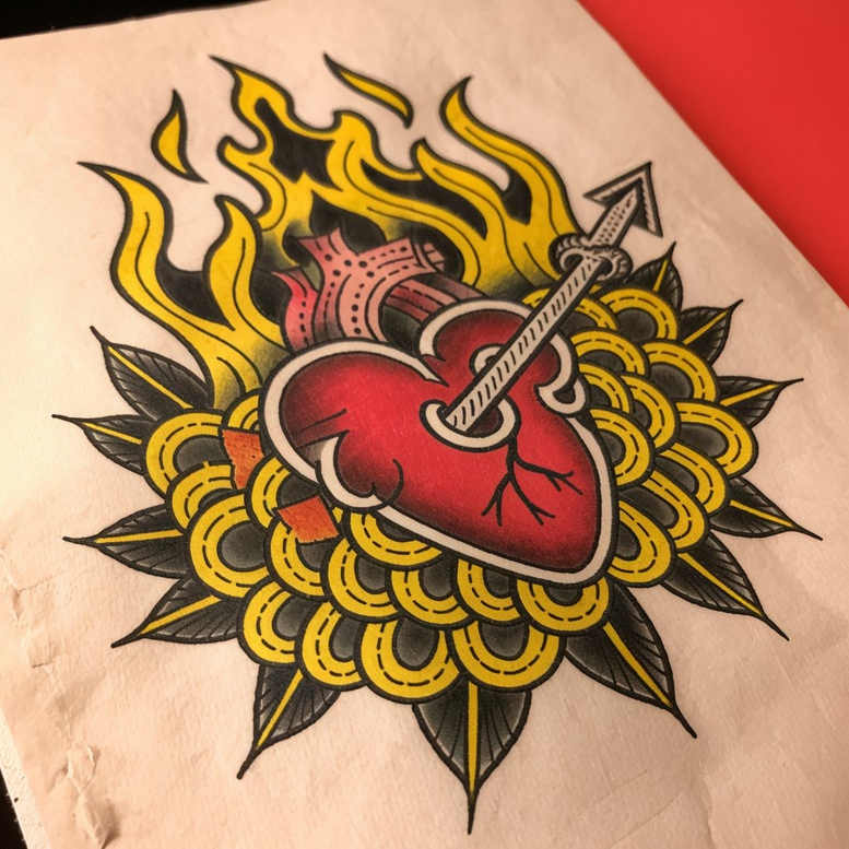 AI-generated tattoo project presents a bold heart and dagger motif framed by a radiant ring of circular patterns and flickering flames. The central element is a red heart, outlined in black with subtle shading to suggest volume, pierced by a steel dagger whose blade points upward, creating a strong diagonal rhythm. Surrounding the heart, concentric circles form a honeycomb-like pattern that extends outward like a sunburst, while sharp black leaves anchor the design and add contrast. Flames rise behind and around the heart in bright yellow and orange, injecting energy and heat into the composition. The palette—red, yellow, black, and skin tone—reads as a vibrant traditional tattoo with modern color blocking, and the clean line work ensures readability at both small and large scales. In terms of technique, solid fills, crisp outlines, and smooth shading define the form, making this tattoo design versatile for placement on the forearm, chest, or calf. Symbolically, the heart conveys love and courage; the dagger suggests protection, struggle, or a turning point; and the surrounding pattern reinforces rhythm, resilience, and continuity. The pattern element is central, providing a cohesive backdrop that can also help conceal older ink when scaled or rearranged, which makes it a potential cover-up option for darker scrawlings nearby. For tattoo artists, the concept invites experimentation with color balance and line weight, with potential adaptations into a black-and-grey rendition or a Japanese-style tattoo depending on client taste. This description threads through the broader vocabularies of tattoo design—meaningful tattoos, fine line tattoo practice, lotus flower tattoo, infinity tattoo, tribal tattoo, rose tattoo design, small tattoos, flower tattoos, custom tattoo design, Japanese style tattoo, and black and grey realism—to connect with readers seeking meaningful body art and ink. As an AI-generated concept, it demonstrates how algorithmic ideas can spark collaboration with artists to translate the heart-and-dagger image into a tattoo-ready work. It can also be rendered as a realistic tattoo with lifelike shading if desired.