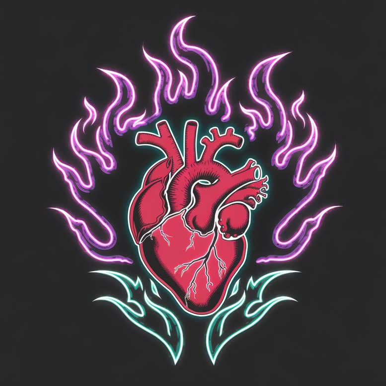 This design presents a stylized anatomical heart in a vivid red, outlined in black, with white vein accents that catch light as if lit from within. A crown of neon purple flames spirals around the heart, creating a radiant halo that pops against a deep black background; at the base, turquoise-teal leaf-like shapes sweep upward, balancing the composition and suggesting growth amid heat. The overall effect is a bold, graphic tattoo concept that translates well to skin, especially on darker canvases where crisp color blocks ensure legibility. As an AI-generated tattoo project used for concept exploration, this piece demonstrates how neon hues and high-contrast linework can yield a striking design while remaining adaptable for placement on the chest, sleeve, back, or thigh. The technique emphasizes clean, precise linework for the heart and flames, with solid color fills and selective shading to convey form and depth without drifting into photorealism. The central heart is rendered with vascular detail and a tonal gradient to evoke volume, while the surrounding flames follow a stylized motion that amplifies energy without overwhelming the core image. The teal accents at the bottom function as negative space in motion, enhancing readability when scaled down to small tattoos; they also introduce a secondary motif that can be echoed in matching pieces for a cohesive set. Symbolically, the heart embodies life and emotion; the flames suggest passion, destruction, and renewal; and the teal components imply growth, balance, and fresh beginnings. For readers seeking meaningful tattoos, this design offers a modern twist on the classic heart-and-fire motif, bridging traditional iconography with a contemporary neon palette. It also aligns with SEO-friendly themes—tattoo, tattoo design, meaningful tattoos, fine line tattoo, floral-inspired elements even as the focus remains on a bold heart, a luminous pattern, and a dynamic silhouette. Given its strong contrast and clear shapes, it’s particularly suitable for cover-up applications, turning existing marks into a vibrant, fresh statement piece.