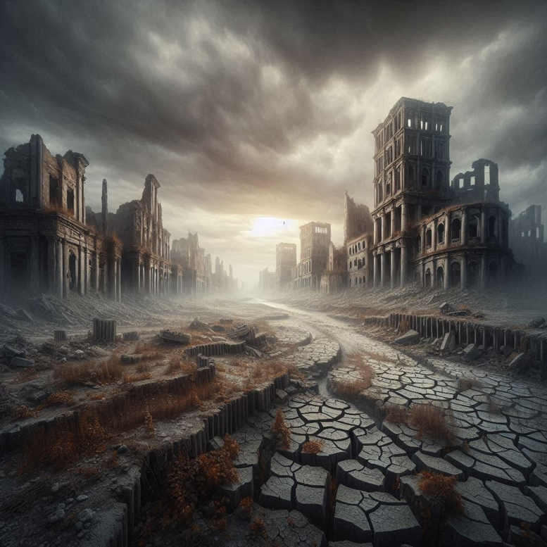 This dystopian ruins landscape is envisioned as a large-scale tattoo design that reads like a post-apocalyptic panorama. The composition centers on a scarred boulevard that winds toward a pale, hazy sun, flanked by collapsed towers and façades that rise in jagged silhouettes from cracked earth. The surface terrain is rendered with a mosaic of polygonal cracks, coarse rubble, and dry vegetation, all executed in black and grey using soft transitions and fine line work to convey depth, smoke, and atmosphere. Subtle cross-hatching and stippling build the texture of weathered stone and dusty air, while the distant horizon and fog create a sense of atmospheric perspective that invites closer inspection in a tattoo session. The left and right ruins frame the scene, suggesting a narrative of abandonment, memory, and resilience; the road’s curvature hints at a journey through ruin toward an uncertain future. If translated into skin, this design benefits from a cover-up strategy: the pattern of cracks and the layered shadows can mask prior ink or scars, with bold negative space and gradual shading preserving detail on larger body areas. The concept originates from AI-generated tattoo projects, offering a fresh take on meaningful tattoos realized in black and grey ink. The imagery is adaptable to various placements—from an inner forearm to a back panel—maintaining legible line work across scales. In the broader context of tattoo design, it aligns with trends in realistic tattoo art, fine line technique, and monochrome landscapes, while also echoing elements of Japanese style shading and structural form. For clients seeking a powerful statement piece, this design embodies a narrative of decay and endurance, making it a strong choice among custom tattoo design options for small tattoos or larger body art, with emphasis on texture, atmosphere, and long-term readability.