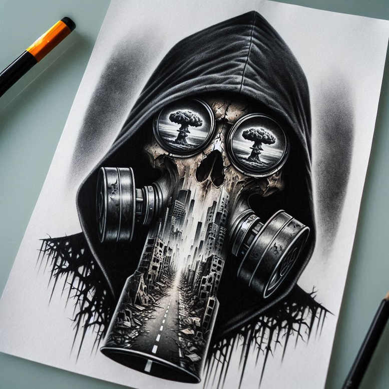 This black-and-grey, hyper-realistic tattoo design centers on a hooded figure wearing a respirator gas mask, the round lenses reflecting a mushroom-cloud skyline. The hood drapes over the head, casting deep shadows that blend into a jagged cityscape pushed to the horizon, with a desolate road leading toward the mask as if the wearer is a gateway to the ruins. Barbed-fence elements bracket the composition, heightening the sense of confinement and threat. The execution combines smooth gradient shading with crisp linework to render metallic textures on the mask, the soft folds of fabric, and the stark geometry of shattered towers. The image carries a powerful narrative: a meditation on resilience amid apocalypse, the tension between humanity and urban entropy, and the idea of renewal through ink. From a technical standpoint, the piece leverages high-contrast black ink to establish a dramatic focal point—the reflective lenses—while graphite-soft shading yields gradient transitions that convey depth and atmosphere. The road’s perspective draws the eye deep into the scene, inviting viewers to imagine a backstory in which the wearer is both observer and participant in a ruined world. As a potential cover-up, the dense negative space around the figure offers ample room to conceal prior marks while the bold silhouette remains legible on larger canvases like the back or chest. This AI-generated tattoo project exemplifies how digital design translates into compelling body art: a contemporary fusion of dystopian motif and classical tattoo technique that appeals to fans of black and grey realism, street-inspired iconography, and meaningful tattoos. In terms of symbolism, the hood and gas mask imply vigilance and protection; the ruined city stands for conflict and renewal; the road signifies a journey, and the fences suggest boundaries and confinement. For clients seeking a custom tattoo design with a strong narrative, this concept provides a scalable, statement-making solution that remains readable from a distance and versatile for various placements.