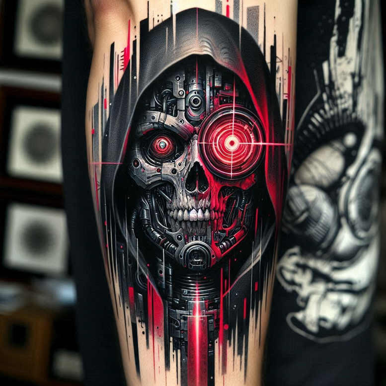AI-generated tattoo project presents a hyper-detailed cybernetic skull fused with exposed gears, lenses, and circuitry, rendered in a dramatic black and grey palette with sharp crimson laser accents. The composition centers on a chrome skull half-veiled by mechanical anatomy, where cog gears peek from the jaw and a red lens-like eye dominates the left side, while precise line work builds a sense of depth and motion. Subtle crosshair lines cut through the piece, creating a rhythm of vertical and horizontal planes that elongate the arm’s curvature and invite closer inspection of the micro-engraved circuitry. The treatment uses high-contrast shading, micro-stippling, and smooth gradient transitions to mimic metallic surfaces, enamel-like highlights, and glassy optics. The textures alternate between brushed steel, polished chrome, and matte shadow, producing a tactile feel as if the ink can be traced under the skin. The red laser elements act as focal points, drawing attention to the eye and central circuitry and giving the design a kinetic, almost sci-fi energy. The stark black background areas concentrate the imagery, while the red accents provide dramatic emphasis without overpowering the grayscale tone. Though the imagery nods to cyberpunk and biomechanical styles, the underlying concept speaks to universal themes of mortality, transformation, and resilience—skull imagery reimagined through technology. The work employs careful layering to ensure readability on the arm’s surface, with bold silhouette cues that hold up at different viewing distances; negative space is used to separate the skull from the surrounding patterns, preserving clarity for both close inspection and broader visibility. As a cover-up friendly piece, its dense shading and graphic geometry can effectively mask older tattoos beneath, while offering a striking new narrative for a bold sleeve. This project is a testament to AI-assisted design translating into ink: an experiment in digital composition informing a tangible, lasting tattoo, and a compelling example within the catalog of fine line tattoos, black and grey realism, and custom tattoo design. From a practical standpoint, the design accommodates a large canvas with potential for future expansion, and the stylized circuitry allows for variations in line weight to suit different body contours. In sum, the tattoo design embodies modern body art—complex, cinematic, and ready for ink, with strong potential as a cover-up for darker, older work.