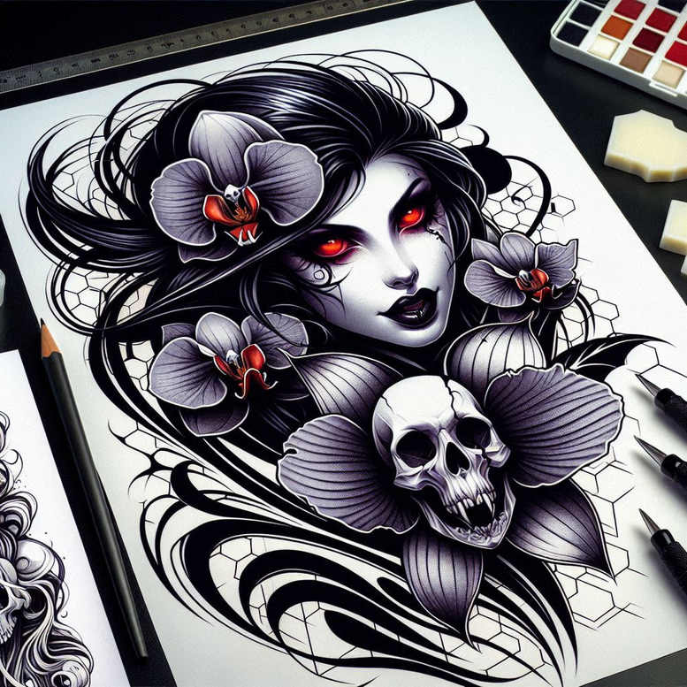An AI-generated tattoo project concept presented in a moody black-and-grey palette, this design centers on a female portrait interwoven with a skull and orchid blossoms, framed by geometric hexagons and flowing hair. The face is rendered with refined shading to capture contour and expression, while the skull provides a stark counterpoint to mortality and beauty. Orchids introduce a soft, organic counterbalance with delicate petals, and a hint of purple adds subtle color in an otherwise grayscale composition. Hexagonal honeycomb lines in the background introduce a contemporary pattern that translates well to placements across the body, from shoulder to forearm. The hair sweeps around the central elements in sweeping arcs, creating motion and cohesion among motifs. Technically, crisp fine-line work defines facial features, petals, and skull details, paired with smooth black-and-grey shading to produce depth and realism. The contrast between sharp linework and soft shading yields a tattoo design that reads clearly from afar and rewards close inspection. The piece blends Gothic vibe with Japanese-inspired restraint, appealing to fans of black-and-grey realism, floral tattoo design, and meaningful tattoos that tell a story. Its dark tonality makes it especially suitable as a cover-up concept for fading or unwanted prior work, while remaining adaptable to larger canvases or compact placements. For collectors, the concept offers a versatile template for custom tattoo design, aligning with trends in fine line tattoo, flower tattoos, and ink storytelling, while inviting personalization in color accents, symbolism, and line density.