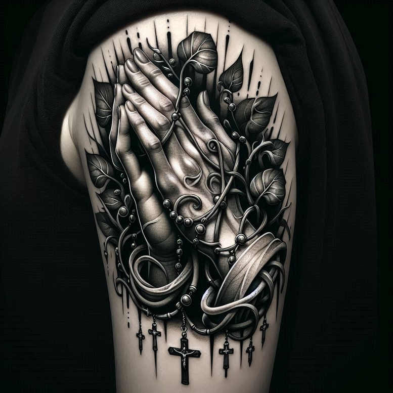 An intricately shaded, black-and-grey tattoo design featuring praying hands pressed in prayer, surrounded by curling vines, leaves, and a string of rosary beads that drape across the forearm. The composition blends gothic realism with devotional symbolism: hands rendered in meticulous light-to-dark contrast, skin texture and knuckle details captured with soft gradients; beads and crosses are lacquered with high-contrast highlights to create depth. The rosary forms a looping frame around the hands, with small crosses hanging at intervals, hinting at faith, memory, and guidance. Vines and leaves weave through the composition, adding organic movement and soft branches that soften the stark imagery. The piece is designed as a modern scripture in ink, suitable for someone seeking a meaningful tattoo design that marries religious iconography with contemporary tattoo aesthetics. The intent is dramatic shading and clean lines, achieving a realistic tattoo vibe with black and grey technique; the dark tonal range allows it to blend seamlessly with existing skin tone and can serve as powerful body art. In AI-generated tattoo projects, this design demonstrates how traditional motifs like clasped hands and rosary beads can be reinterpreted through tight linework, dotwork shading, and careful weight distribution. The result is a versatile, cover-up-friendly piece that could mask older tattoos while maintaining a strong narrative: devotion, resilience, and faith. The pattern elements—recurrent beads, scroll-like ribbons, and trailing crosses—provide a cohesive motif that reinforces the design’s unity. For keyword-rich search, this tattoo design aligns with terms such as fine line tattoo, black and grey tattoo, realistic tattoo, rose tattoo design, and custom tattoo design; though not a rose, the same precision and balance are applied to convey emotion and symbolism in a compact forearm canvas. The work doubles as a study in negative space around the hands and as a testament to the artist’s craft in rendering texture, light, and form, with an emphasis on the interplay between solid black saturations and soft gradations that make the rosary beads pop. If the client seeks a bold, timeless piece that can cover a prior tattoo, this project is an excellent match, offering a timeless, reverent image that remains legible and impactful as a permanent ink narrative.