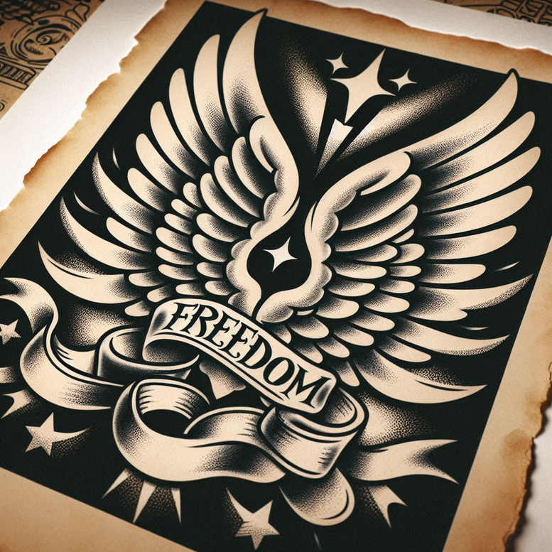 This AI-generated tattoo project presents a bold black-and-grey composition centered on a pair of wings arching upward, a flowing ribbon banner bearing the word FREEDOM, and scattered stars set against a dense dark field. The design relies on crisp outlines and smooth gradient shading, with dappling and stippling used sparingly to add texture without overpowering the silhouette. The wings are built from layered feathers that taper into soft shadows, creating a sense of lift and motion, while the ribbon wraps around the core motif, its ends curling to frame the banner text. The star accents punctuate the negative space, acting as celestial punctuation that reinforces the freedom theme. Technically, the piece leans toward a traditional blackwork aesthetic: thick black outlines, solid fills, and strategic white highlights to preserve readability at larger and medium sizes. The overall composition is designed to translate well onto the skin for placement on the upper arm, chest, or back, delivering a high-contrast image that remains legible from a distance. In symbolism, wings denote ascent and liberation; the FREEDOM banner reinforces personal resolve; stars offer guidance and hope. From a tattoo design perspective, this project demonstrates a classic motif set—wings, banner, and stars—reimagined with contemporary shading to read clearly in black and grey, making it suitable for a range of skin tones and body contours. As an AI-generated tattoo project, it showcases how modern design tools can produce striking, transfer-ready concepts that honor traditional tattoo language while offering versatile options for customization. This piece can also function effectively as a cover-up design due to its dense black areas and strong silhouettes, enabling concealment of prior ink while preserving a bold, graphic statement. The pattern-focused nature of the artwork ensures it translates well as a repeatable visual motif in tattoo portfolios, reinforcing its suitability for clients seeking meaningful tattoos that still read clearly from a distance. Keywords aligned with search intent include tattoo, tattoo design, meaningful tattoos, fine line tattoo, lotus flower tattoo, infinity tattoo, tribal tattoo, rose tattoo design, small tattoos, flower tattoos, custom tattoo design, Japanese style tattoo, black and grey, realistic tattoo, body art, ink.