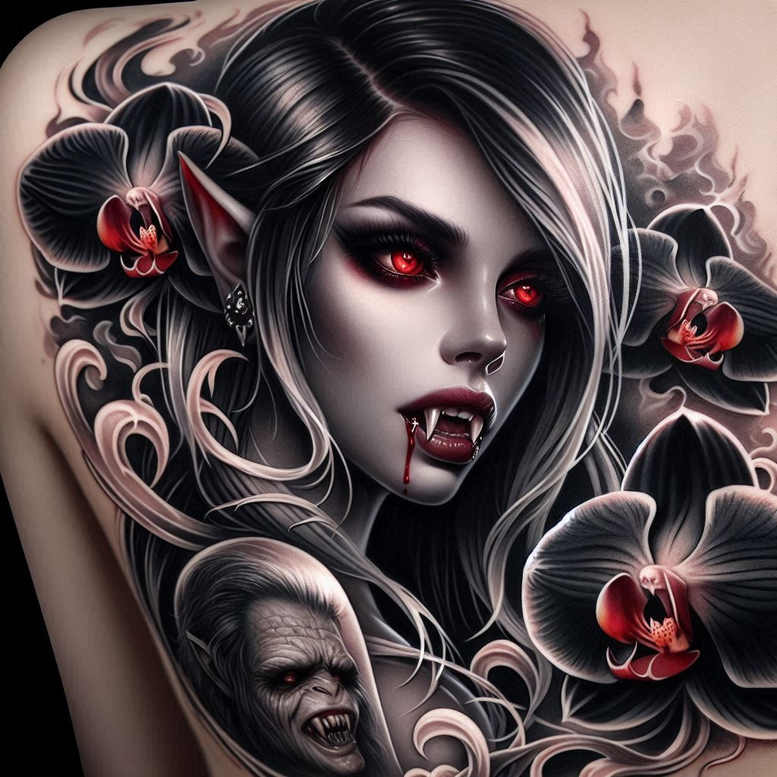 An AI-generated tattoo concept rendered in a moody black and grey palette with red accents, this design combines gothic allure with botanical softness. The central figure is a vampire woman whose pale skin and angular features are sculpted with smooth shading, while crimson eyes and a trickle of blood at the lips introduce an intimate sense of danger. Flowing, silvery-black hair wraps around a cluster of orchid blooms, whose petals curl in stylized waves that echo traditional ink patterns. A small, snarling demon face peeks from the lower edge, anchoring the composition in dark fantasy storytelling. The piece relies on high-contrast lighting and refined linework to simulate a realistic tattoo appearance, suitable for a bold forearm, sleeve, or back placement. The orchids lend a delicate counterpoint to the vampiric motif, symbolizing beauty, mystery, and metamorphosis, while the fangs and blood speak to nocturnal passion and personal meaning. For a cover-up, the dense blacks and layered elements are designed to mask older lines or scars, with the negative space guiding the eye away from blemishes toward the eyes and blossoms. Pattern-rich curves and negative space create movement that reads well in tattoo form, and the overall composition nods to Japanese ink aesthetics without relying on a specific tribal or stylistic label, making it a versatile, contemporary black and grey piece. This is an AI-generated tattoo project that demonstrates how modern technology can inspire meaningful tattoos and unique, market-ready designs; it’s easy to adapt the concept to a larger canvas while preserving core motifs: vampire, orchid, and a play of light and shadow. The SEO-friendly keywords woven through the narrative—tattoo, tattoo design, meaningful tattoos, fine line tattoo, lotus flower tattoo, infinity tattoo, tribal tattoo, rose tattoo design, small tattoos, flower tattoos, custom tattoo design, Japanese style tattoo, black and grey, realistic tattoo, body art, ink—enhance discoverability for clients seeking bold, symbolic ink. If the final artwork leans toward deeper blacks, it remains an excellent cover-up solution, ensuring the concept stays relevant for clients looking to transform existing tattoos with a dramatic, elegant motif. This AI-generated tattoo project showcases how algorithm-driven creativity can yield striking, professional-level imagery ready for translation into real-world body art.