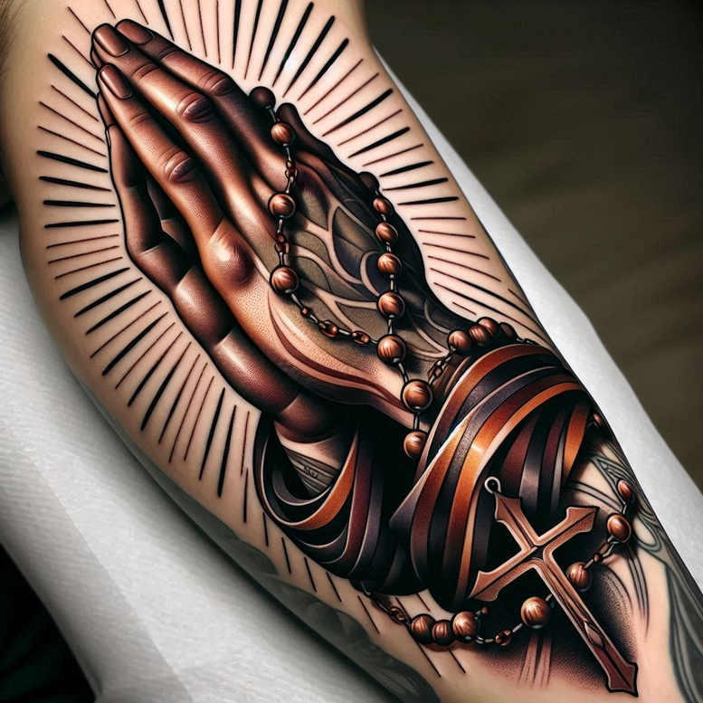 This AI-generated tattoo project presents a hyper-realistic depiction of praying hands clasped in devotion, draped with a rosary that wraps around the wrists and leads to a hanging cross. The composition is rendered in bold black and grey shading with smooth transitions, creating dramatic contrast between the skin tone and ink. Radiating lines behind the hands function as a subtle graphic pattern, extending the sense of reverence and focus on the prayer gesture. The cross pendant and rosary beads are meticulously rendered with highlights that give them a tactile, almost sculptural quality. Ribbons wrap around the forearm, adding motion and depth while accentuating the central sacred motif. This piece embraces religious iconography with a contemporary tattoo design approach, combining realism with ornamental elements for a lasting body art statement. The design is ideal for a cover-up thanks to its strong blacks and layered shading that can mask prior imagery, while still preserving a readable foreground image. As an AI-generated tattoo project, it demonstrates how digital concept-to-skin translation can produce a powerful, meaningful tattoo option with broad appeal. This tattoo design can be adapted for larger surfaces or scaled for smaller placements, maintaining the same symbolism of faith, devotion, and protection. Keywords include tattoo, tattoo design, meaningful tattoos, realistic tattoo, black and grey, body art, ink, cross tattoo, rosary tattoo, prayer, and sacred iconography.