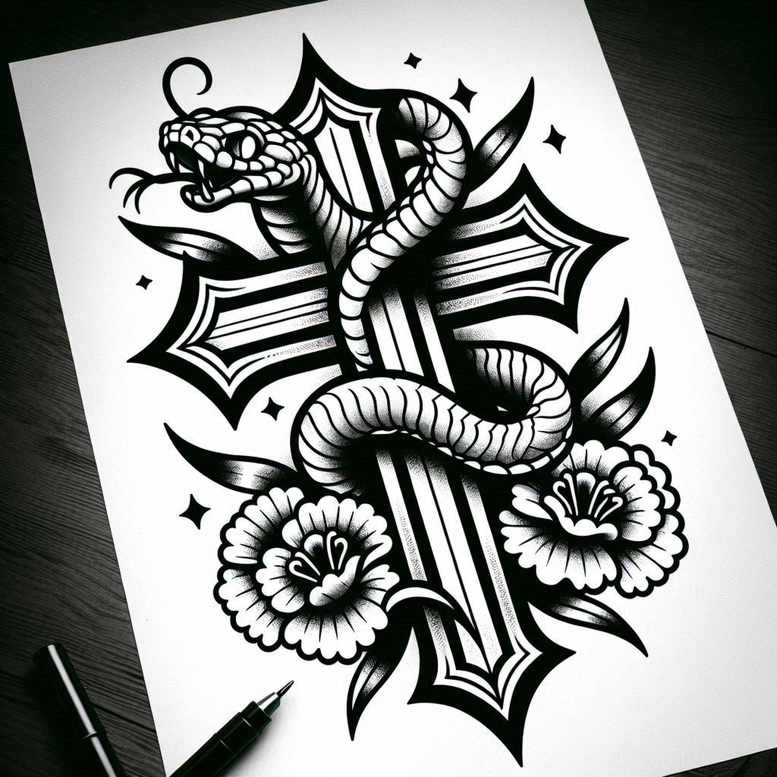 AI-generated tattoo project: A dramatic black and grey design featuring a Gothic cross pierced by a coiled snake, with two blossoms anchoring the lower arms. The cross is rendered with heavy outer ribs and inner facets, giving it a carved angular silhouette, while the serpentine body wraps around in a fluid S-curve; the scales are stylized into crisp geometric facets that create a graphic pattern read at distance. The two flowers sit at the base, their petals layered with careful shading to contrast with the bold lines. Small stars scatter around to enhance negative space and depth. A subtle gradient from near-black to mid-grey enriches the piece and helps it sit on the skin with lasting clarity. The arrangement relies on high-contrast fills and controlled shading to preserve legibility on larger areas, making it a strong candidate for a cover-up by masking an older tattoo beneath the dense silhouette. The design nods to traditional American tattoo aesthetics while incorporating touches of Japanese linework balance, resulting in a piece that reads as a protective emblem and a bold body art statement. Symbolically, the snake suggests rebirth or vigilance, the cross faith or endurance, and the flowers renewal. This AI-generated tattoo project demonstrates how graphic patterns and organic forms can harmonize in one composition, offering a compelling blueprint for custom tattoo design and ink.