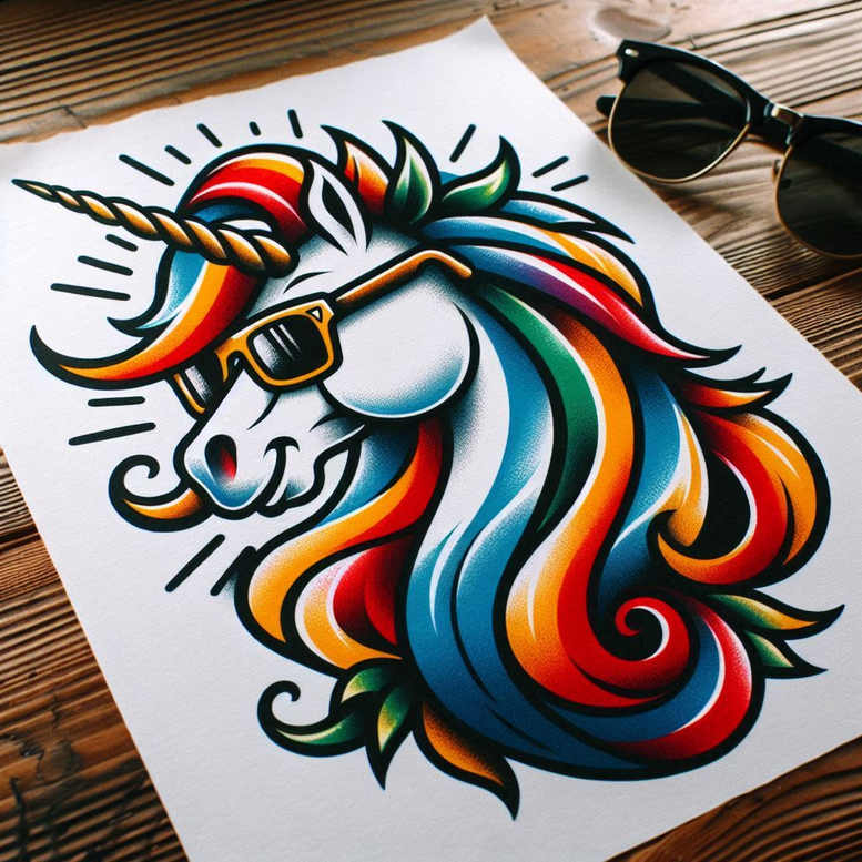 This vibrant concept presents a unicorn portrait crafted for tattoo design exploration. Executed in a bold, graphic style with clean black outlines and saturated rainbow colors, the piece centers on a joyful unicorn head adorned with a spiraling horn and a pair of sunglasses. The mane flows in ribbons of crimson, orange, yellow, green, blue, and violet, creating a dynamic contrast against the white backing page that serves as the canvas impression in the shot. The piece reads as a versatile tattoo idea suitable for a variety of placements, from a forearm panel to a thigh sleeve, thanks to its compact silhouette and strong color blocks. The design embraces a graphic pattern approach: repeated curved shapes and stripes create a rhythmic pattern that enhances legibility on skin and translates well into both color and black-and-grey adaptations. While the image is a concept, the underlying lines are crisp and scalable, enabling a tattoo artist to render it with confidence. In the context of modern ink culture, this concept fits into a spectrum of tattoo designs emphasizing playful symbolism and bold color, aligning with keywords such as tattoo design, colorful tattoo, meaningful tattoos, and fine line tattoo in some iterations. Though the piece uses vivid color, a black ink outline anchors the shapes to maintain clarity on different skin tones. The layered shading on the mane adds depth and helps imply light sources, creating a three-dimensional feel while preserving a stylized, graphic look. As an AI-generated tattoo project, it serves as a starting point for further customization, enabling the client and artist to adjust proportions, color balance, and line thickness to suit personal style. If a client seeks dedicated patterns, the motif offers opportunities for additional texture, such as subtle dot-work fills or secondary linework, while preserving its legibility as a standalone tattoo. The concept also aligns with broader tattoo categories like Japanese-inspired motifs, bold color work, and modern pop-art aesthetics, inviting experimentation with placements and scale while remaining accessible to beginners exploring small to medium-sized tattoos.