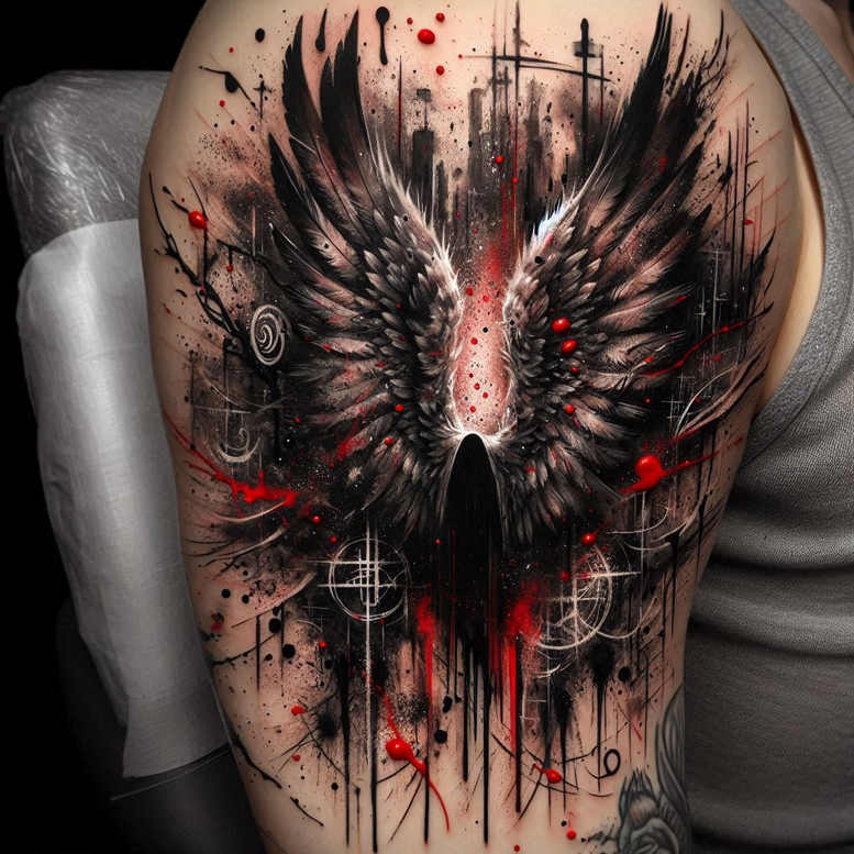 This AI-generated tattoo project presents a dramatic wing motif rendered in black and grey with selective red splashes. The composition centers on a pair of sweeping wings whose feathers are detailed through fine shading and painterly contrasts, blending realism with abstract ink-splash elements. Angular circles and circular motifs intersect the wings, while jagged lines and downward drips establish a bold vertical rhythm that guides the eye along the arm’s contours. The artwork sits on a dark field, enhancing depth and providing a strong silhouette that would work exceptionally well as a cover-up, concealing older ink beneath a cohesive, contemporary narrative. The technique merges tight featherwork with soft gradient transitions, accompanied by splatter textures and geometric geometry to evoke motion and energy. The red accents act as focal punctuations, delivering life and impact without overpowering the monochrome core, resulting in a pattern-rich tattoo design suited for meaningful tattoos, small tattoos, or a personal emblem. Symbolically, wings convey protection, ascent, and freedom, while the circular motifs suggest cycles and continuity; together they create a layered story ideal for a custom tattoo design or Japanese-influenced body art, especially in black and grey and ink-focused styles. As an AI-generated concept, this project demonstrates how digital ideation translates into ink-ready designs, offering a bold, versatile cover-up option that maintains longevity on skin while inviting future additions. For clients seeking a refined yet striking piece, this winged design delivers a powerful statement with room for personalization and scale, embodying the essence of tattoo design, meaningful tattoos, and modern body art.