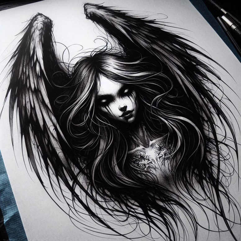 An arresting black-and-grey illustration of a winged female figure rises from a tangle of hair, wings sweeping upward, with a bold chest tattoo that blooms into an ornamental pattern. Executed in dense line work and selective shading, the design relies on negative space and cross-hatching to carve depth and a sculptural silhouette. The wings are rendered with feathery, sweeping strokes that convey motion and grace, while the face carries a calm, enigmatic expression. The chest motif unfolds as a dense floral-vine pattern, suggesting personal symbolism or a protective talisman. Because of its heavy black shading and tight composition, the piece is clearly a candidate for a cover-up, offering a powerful new narrative over an existing mark while preserving the body’s natural lines. The artwork straddles fine line tattoo language and black-and-grey realism, delivering bold contrast for large canvases yet maintaining clarity in smaller applications. From a technical perspective, varied line weights, crisp outlines, and controlled stippling create texture and depth that read as body art on skin. For clients seeking meaningful tattoos, this concept provides a versatile path—an angelic wing motif that can be scaled, simplified, or expanded with color by a veteran artist, while maintaining a timeless, contemporary aura that aligns with rose tattoo design, lotus flower tattoo, tribal tattoo, and other flower tattoos. The piece also nods to Japanese style tattoo influences through its disciplined composition and flowing line work, while staying firmly in a black and grey palette appropriate for a cover-up. As an AI-generated tattoo project, it demonstrates how modern AI tools can yield professional ideas suitable for customization as a tattoo design, tattoo idea, or small tattoo inquiry, inviting exploration of ink, meaning, and personalization. In short, the dark, graphic energy of this rendition, with its mix of feathered motion and orchid-esque pattern, makes it an excellent starting point for a cover-up that respects prior work while offering a fresh, striking identity in the world of body art.