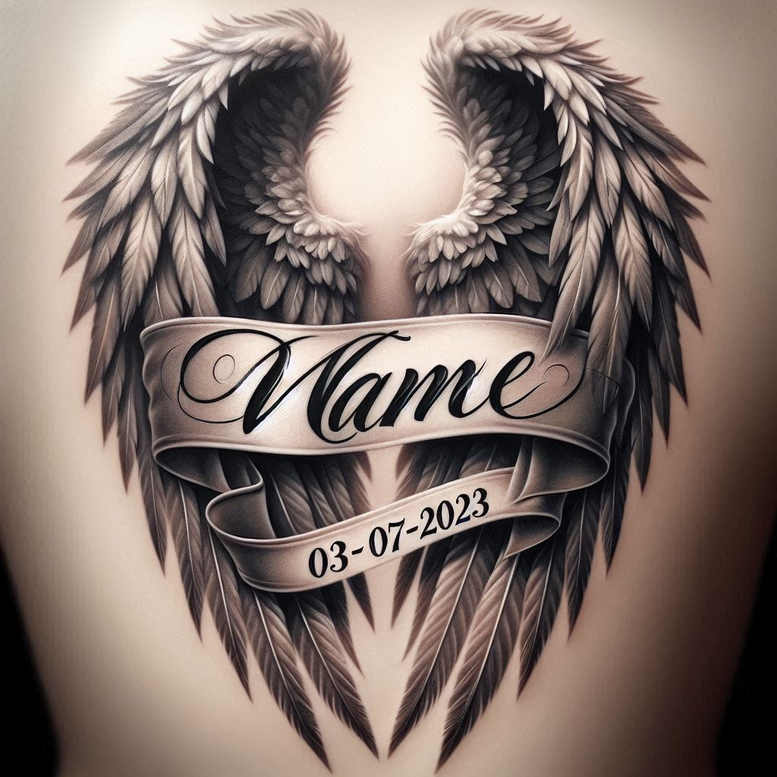 This memorial tattoo concept centers on the sovereignty of Jesus Christ and the comfort of faith, expressed through a pair of wings that cradle a heart in black-and-grey realism. The wings flank and fold toward the center, their feathers rendered with fine line tattoo technique and layered shading to create depth and motion, while the heart silhouette emerges from the negative space, symbolizing love under divine protection. A ribbon banner spans the middle of the composition, bearing the wearer’s name and a date, transforming the piece into a personal memorial that speaks to devotion, memory, and eternal grace. The art draws on traditional motifs found in sacred art and stained-glass influences, yet remains contemporary in its execution, with crisp line work, smooth gradients, and a restrained grayscale palette that respects the body’s contour. The design is deliberately balanced, allowing the banner text to read clearly while the wings maintain a sense of movement and reverence. As an AI-generated tattoo project, it demonstrates how faith-inspired imagery can be realized with modern technique, resulting in a timeless piece suitable for a chest, back, or shoulder. The symbolism is straightforward yet powerful: wings for heavenly guardianship, a heart for love and sacrifice, and the banner for personal tribute—an invitation to reflect on Jesus’ kingship and mercy. For those seeking meaningful tattoos, this black-and-grey, realistic design blends classic religious iconography with contemporary craft, and can be adapted to different sizes or placements without losing its legibility or impact. Because the image relies on strong blacks and careful shading, it is also a prime candidate for a cover-up, able to mask older ink while introducing a sacred motif with clear, legible text as it heals. The piece also embraces the language of classic tattoo culture—custom tattoo design, body art, and ink—while keeping a reverent tone that honors the believer and the memory it preserves.