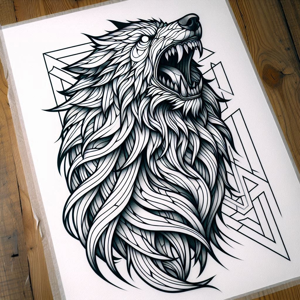 An AI-generated tattoo project concept depicting a howling wolf rendered in dense, intertwined linework that forms a dynamic fur pattern, with a geometric backdrop of intersecting triangles. The piece uses a bold black and grey palette and a fine line technique to sculpt depth, texture, and motion without color. The wolf’s maw opens in a roar, teeth and tongue carved with crisp strokes, while flowing mane-like strands weave into abstract ribbons that nod to tribal and Japanese style tattoo elements, yet remain a singular, cohesive creature. The geometric shapes behind act as a modern frame that contrasts with the organic fur, heightening drama and balance. This tattoo design reads as both a powerful wildlife symbol and a contemporary design study; varied line thickness creates subtle shading and negative space adds breath and structure. The concept supports flexibility for scaling—from small tattoos to larger back or shoulder pieces—depending on the client’s canvas. While strongly graphic, the work remains adaptable to cover-up needs where old ink lies beneath the new lines, thanks to bold, overlapping shapes and dense black areas. Symbolically, the wolf conveys guardianship, strength, and resilience, while the geometry suggests order, precision, and modernity; together they tell a narrative of primal power fused with design craft. As an AI-generated tattoo project, it demonstrates how algorithmic artistry can spark meaningful tattoo ideas, inspire custom tattoo design, and guide ink for body art in black and grey. The concept dovetails with trends in fine line tattoo and could be adapted to lotus flower tattoo, infinity tattoo, or rose tattoo design motifs if the client desires a personal symbolism.