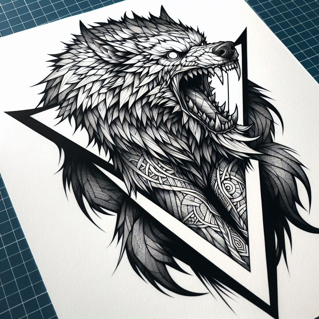 This black-and-grey tattoo study depicts a snarling wolf head sketched in dense fine-line work, overlaid with geometric triangles that slice across the composition. The piece relies on precision linework, stippling, and cross-hatching to render the wolf’s fur as a dynamic field of tapered, overlapping strokes that shift from satin grey to near-black. The geometric elements are not mere decoration but structural motifs that frame the animal’s snout and jaw, creating a tension between organic form and rigid geometry. This is an AI-generated tattoo project, offering a bold concept suitable for a cover-up thanks to its heavy black shading and prominent negative space. The composition uses a white background as negative space to let the dark silhouette pop when placed over existing ink. The triangles provide directional flow that can mask older tattoos while maintaining a strong focal point. The symbolism combines the wolf as a guardian and symbol of strength with triangles as facets of structure and balance, yielding a modern, high-contrast body art statement. Technique blends fine-line detailing with broader black fills to achieve depth while keeping edges crisp for skin longevity. The design demonstrates how graphic patterns and animal imagery can converge into a unified tattoo design, offering scalable options from small forearm pieces to larger back works.