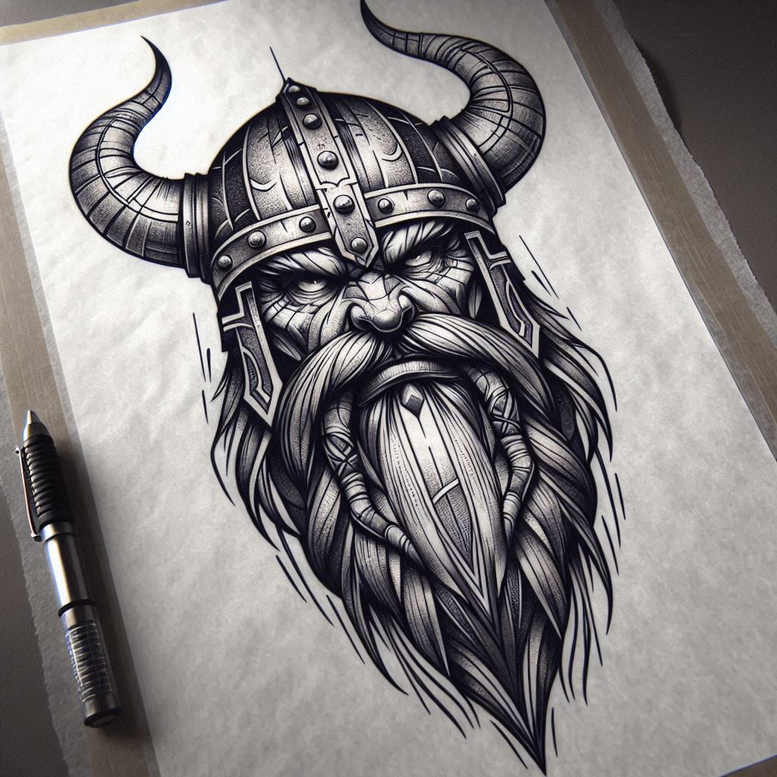 Featuring crisp black-and-grey line work, this AI-generated tattoo project presents a horned Viking helmet perched above a voluminous, braided beard. The helmet is detailed with riveted plates, segmented bands, and a central face guard, all rendered with careful cross-hatching and subtle stippling to achieve a textured metallic look. The horns sweep outward in bold arcs, their shading transitioning from deep black to mid-gray to create a three-dimensional form that anchors the composition. The beard flows as a cascade of individually defined strands, with negative space carved between the locks to suggest movement and depth, while the lower arrangement tapers to a pointed tip that doubles as a natural focal point for a back or sleeve piece. The design relies on high-contrast black and grey shading to read clearly from a distance yet reward close inspection with a treasure trove of line-work patterns, making it suitable for a realistic tattoo approach or a stylized interpretation. The graphic plate motifs and geometric strap elements echo pattern-like repetition, reinforcing a powerful rhythm across the canvas. Symbolically, the helmet evokes protection and warrior spirit; the beard implies wisdom and endurance; together they tell a story of journey and strength, a theme common in meaningful tattoos and custom tattoo design portfolios. While this is an AI-origin concept, it is intended as a blueprint that tattoo artists can adapt to individual placement, skin tone, and size, bridging classic Norse iconography with contemporary fine-line and black-and-grey techniques, and aligning with trends in Japanese-style tattoo influences and tribal-inspired detailing. This concept also serves as a versatile foundation suitable for the tattoo design process, offering scalability for small tattoos or large pieces, and inviting exploration of additional motifs like runes or wind-inspired negatives to personalize meaning within the body art framework.