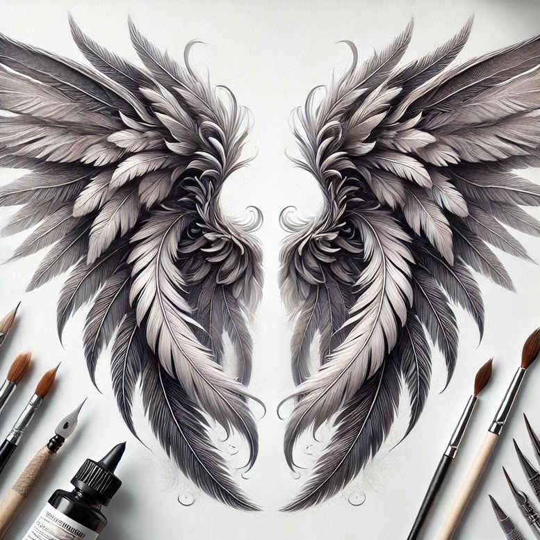 This is an AI-generated tattoo project presenting a grayscale study of feathered wings. The composition features two symmetrical wings formed by layered plumes that curve toward each other, creating a bold silhouette that works as a back, shoulder, or chest piece. The rendering relies on fine line technique to reproduce dozens of individual feathers with precise line work, subtle cross-hatching, and soft gradients that produce depth while maintaining a cohesive black and grey palette. Outer feathers arc outward with tapering points, while inner plumes trace a gentle inward contour, yielding a dynamic sense of motion and lift. As a tattoo design, the piece remains scalable and adaptable to different body contours, allowing the artist to adjust the size and placement without losing legibility. For meaningful tattoos, wings symbolize ascent, freedom, protection, and personal growth, aligning with themes of guidance and resilience; the grayscale execution lends timeless elegance and makes it compatible with more minimalist or realistic interpretations. The image also doubles as a pattern study, useful for exploring feather texture, rhythm, and negative space in larger body art projects or as a stand-alone symbol of strength. Whether inked as a back piece or a shoulder accent, the composition relies on controlled contrast to preserve readability over time, ensuring longevity of the fine lines. This illustrated concept demonstrates a custom tattoo design that prioritizes clean geometry, balanced shading, and a harmonious grayscale spectrum; for fans of Japanese style or tribal-inspired motifs, the wings offer a refined alternative to busier patterns. Overall, the artwork showcases how black and grey ink can convey depth and movement without color, appealing to lovers of small tattoos, flower-inspired pieces, and other meaningful tattoos while remaining faithful to classic tattoo techniques. Note: this is an AI-generated tattoo project, presented as a professional study in line work and form.