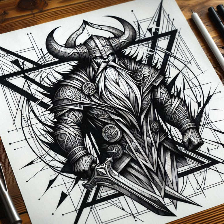 This AI-generated tattoo project presents a dramatic blackwork concept featuring a horned Viking warrior rendered in geometric linework. The central figure wears a weighty helmet and layered armor, gripping a broad sword as if poised for battle. The composition relies on interlocking panels, sharp facets, and circular sigils to build depth and texture while maintaining a cohesive silhouette. Surrounding the warrior is a lattice of straight lines, triangles, and circular motifs that create an energetic aura around the figure, enhancing the design’s dynamic rhythm and graphic clarity. The shading transitions from dense black to subtle midtones, with fine line accents suggesting leather textures, metal gleam, and skin tension, which is ideal for a high-contrast black and grey tattoo. Given its dense black shadows and prominent geometric patterns, this design is an excellent candidate for a cover-up, capable of concealing previous marks while delivering a striking new body art statement. As an AI-generated concept, it demonstrates how modern tattoo design can merge traditional motifs with contemporary geometry to produce meaningful tattoos for a wide audience seeking powerful ink. The warrior embodies protection and resilience, the horned helm evokes mythic ferocity, and the layered patterning implies depth and movement. This concept aligns with keywords such as tattoo, tattoo design, meaningful tattoos, fine line tattoo, lotus flower tattoo, infinity tattoo, tribal tattoo, rose tattoo design, small tattoos, flower tattoos, custom tattoo design, Japanese style tattoo, black and grey, realistic tattoo, body art, and ink. The piece reads as a bold, graphic narrative that scales well on the arm, shoulder, or chest, while remaining adaptable to personal symbolism and size. For variations, artists can simplify the linework for a refined look or intensify the black blocks to enhance cover-up effectiveness without sacrificing the dramatic impact. Overall, it showcases how a graphic warrior can translate into meaningful body art, anchored in black and grey tones and reinforced by geometric patterning that is both aesthetically striking and technically versatile.