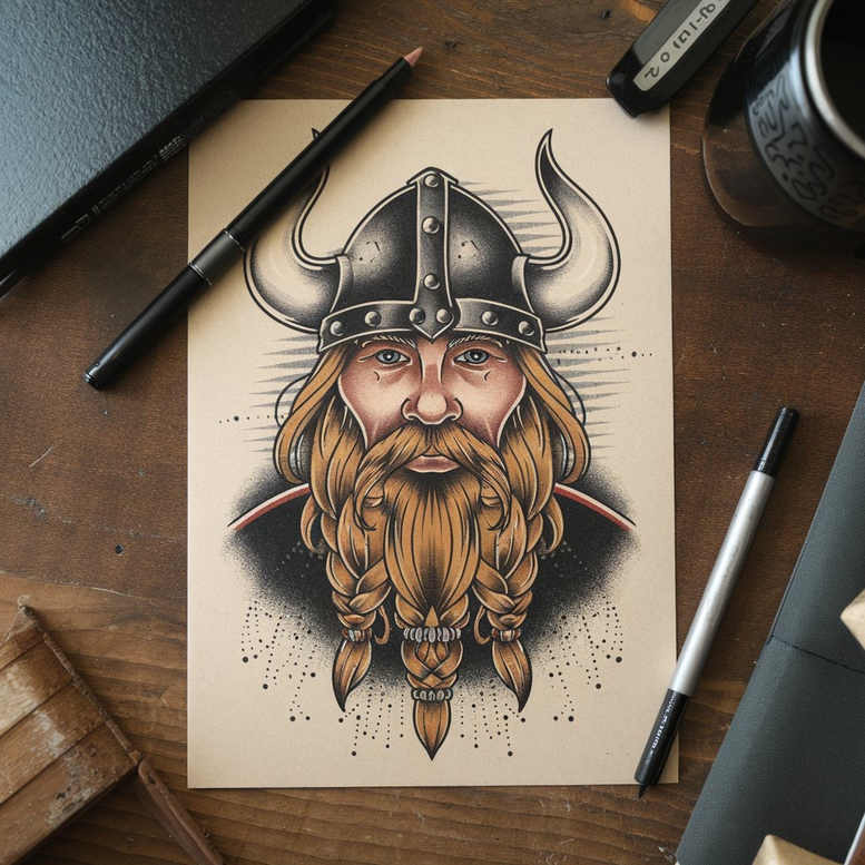 Presented as an AI-generated tattoo project concept, this Viking portrait centers on a horned helmet and a full braided beard, rendered in warm browns and golden blond hues with bold black linework. The piece reads as a color illustration with depth achieved through soft shading and stippled dotwork around the corona, giving a subtle pattern that reinforces texture while keeping the focus on the face. The helmet’s rivets and curved horns provide instant iconography that nods to Norse myth while the tailored braids fan down symmetrically, leading the eye to the determined expression in the blue eyes. Although clearly testable as a tattoo design, the concept also adapts to different scales: it can anchor a small tattoo as a standalone piece or expand into a larger sleeve or backpiece. In terms of technique, the design leans into a realistic yet graphic approach with crisp outlines and painterly color blocks, suitable for both color and black and grey executions; it demonstrates how bold linework can coexist with shading gradients to render lifelike skin tones and hair. The symbolism is mythic and personal—valor, lineage, and protection—making this a meaningful tattoo option for clients seeking a striking figure with timeless appeal. The AI-generated origin offers a fresh interpretation of Nordic imagery and provides a flexible blueprint for a custom tattoo design that embraces traditional motifs while staying contemporary in body art, ink, and overall composition. Keywords such as tattoo design, meaningful tattoos, fine line tattoo, tribal tattoo, rose tattoo design, Japanese style tattoo, black and grey, realistic tattoo, and ink-ready concepts are embedded to optimize search visibility.