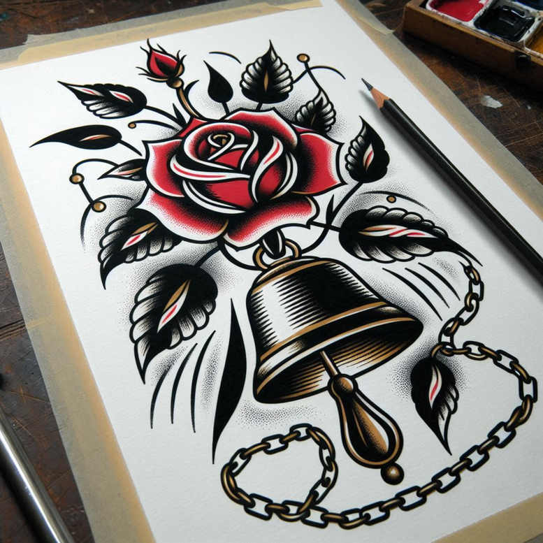 This AI-generated tattoo project presents a bold, traditional-inspired composition centered on a vivid rose paired with a bell and a looping chain. The design relies on clean black outlines, dense shading, and selective color accents to create a striking read from a distance while remaining legible up close. The rose’s petals are rendered with smooth gradations and crisp highlights that echo classic tattoo art, while the bell adds a symbolic note of memory, duty, or a call to attention. The chain binds the elements together, suggesting connection, commitment, or the passage of time—themes often explored in meaningful tattoos. Leaves frame the bouquet with jagged edges and stippling texture, adding depth without crowding the central motifs. Although the sheet appears as an AI-generated mockup, the line work mirrors traditional tattoo aesthetics and would translate well to skin with bold, long-lasting ink. The composition emphasizes high contrast and strong silhouettes, ensuring readability in black and grey or with color. For a cover-up project, the dense dark shading around the petals and bell can be extended to obscure underlying work while preserving the new rose motif. This piece demonstrates a versatile custom tattoo design that blends flower tattoos with a classic bell motif, showing how color accents—red on the petals and warm metallics on the bell and chain—enhance legibility across skin tones. Technique-wise, the design draws on traditional and neo-traditional sensibilities, pairing bold linework with controlled shading and a curated palette. For clients seeking small tattoos or flower tattoos imbued with symbolism, this rose-bell-chain concept offers a timeless option for a meaningful tattoo. The imagery also adapts to Japanese style influences or a monochrome black and grey treatment if desired, and it can be integrated with other elements in a larger body art piece. Whether the goal is to honor memory, devotion, or milestones, this concept communicates intent through its iconic motifs and confident execution; as an AI-generated tattoo project, it provides an adaptable starting point for artists to refine into final ink. Keywords include tattoo, tattoo design, meaningful tattoos, fine line tattoo, lotus flower tattoo, infinity tattoo, tribal tattoo, rose tattoo design, small tattoos, flower tattoos, custom tattoo design, Japanese style tattoo, black and grey, realistic tattoo, body art, ink.