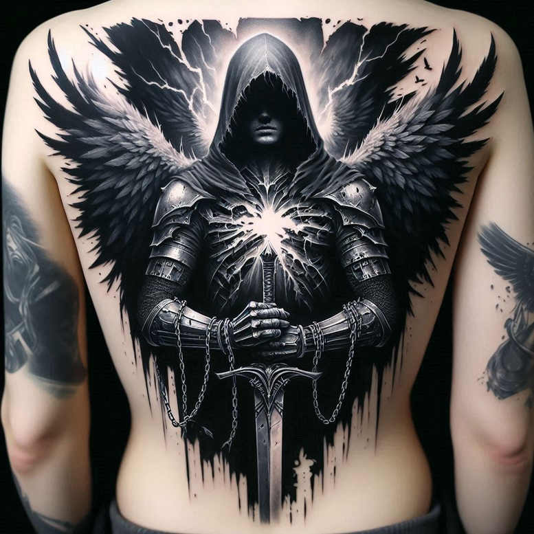 An imposing backpiece rendered in black and grey realism, this AI-generated tattoo project centers on a hooded figure framed by expansive wings. The composition highlights a radiant glow at the chest, where the figure’s hands clasp a longsword; the blade descends toward the lower spine, while chains drape from the wrists, adding a restrained, ritual air. Armor plates contour the forearms and shoulders with meticulous rivets and segmented panels, contrasting with the soft feathering of the wings that extend outward in dramatic arcs. The hood conceals the face, heightening the sense of mystery and power, while negative space around the chest glow and sword pommel keeps the focal point clear and legible across a large canvas. The use of high-contrast ink creates depth and texture, giving metallic reflections on the armor and a stark silhouette against the wearer’s back. This design is crafted for a substantial back tattoo, allowing room for extended wing span, intricate sword work, and chain details to be refined in a single, cohesive piece. It also stands as a compelling cover-up option for someone seeking to replace an older tattoo with a bold, high-contrast image. Symbolically, the fusion of winged guardian imagery with armor speaks to protection, resilience, and inner strength, while the radiant heart-light at the chest can be read as a beacon of hope serenely anchoring the composition in the midst of shadow. The piece showcases how AI-generated tattoo concepts can translate into professional body art, blending realistic shading, feather texture, and metallic gleam in a single, striking back tattoo. For tattoo enthusiasts, it offers a narrative-driven design that remains legible from a distance yet rich in detail on close inspection, making it suitable for those pursuing meaningful tattoos and expansive back pieces. As a showcase of cutting-edge design, the project demonstrates the potential of AI-generated concepts to inform custom tattoo design, while maintaining compatibility with traditional line work, shading, and the craft of skilled tattoo artists.