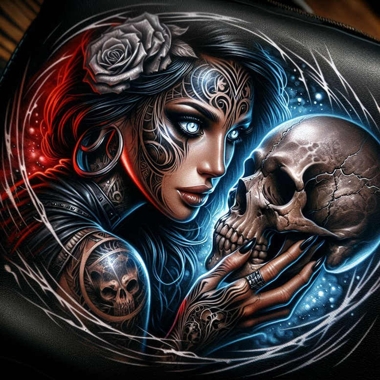 This AI-generated tattoo project presents a richly detailed portrait that blends feminine allure with dark symbolism. The central figure is a woman with a geometrically tattooed face, her gaze rendered in cool blue tones that contrast with the warm red halo along the hairline. A meticulously inked skull, clenched in her hands, pairs with a blooming rose tucked into her hair, creating a narrative of life and mortality. Circular wisps and geometric patterns sweep around the composition, framing the subject in a halo of light and shadow. The piece uses fine-line technique to render delicate lace-like linework across the facial filigree and arm tattoos, while bold shading provides volume and a sense of realism. Color plays a crucial role here: electric blues highlight the hair and eye sockets, scarlet and crimson gradients accent the red accents, and dense black lines anchor the silhouette, yielding a black-and-grey feel amid splashes of color. The tattoos themselves are a blend of tribal-style motifs and ornamental swirls, echoing Japanese-inspired linework while maintaining a contemporary edge. The palm and fingers cradle the skull with a protective, almost ceremonial gesture, reinforcing a motif of acceptance and the cyclical nature of existence. This is a highly technical design that would translate well to a large back or sleeve, yet its fine-line detail also lends itself to smaller, discreet applications for collectors seeking a meaningful tattoo. It is specifically described as a cover-up-worthy piece due to its dense darkness and bold contrasts, ensuring clients understand its suitability for concealing older work while delivering a powerful new look. The painting-like quality and AI-origin emphasize that these are AI-generated tattoo projects exploring modern motifs, contrast, and artistry, designed to inspire both artists and clients in the field of body art.
