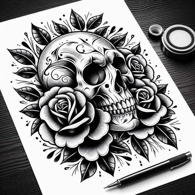 This AI-generated tattoo project presents a bold black-and-grey composition, centered on a sculpted skull surrounded by lush roses and stylized leaves. The design relies on crisp linework and dense shading to create depth, a hallmark of fine line tattoo and black and grey realism. The skull’s hollow eye sockets and nasal cavity anchor the piece, while the roses weave through and around it, forming a balanced circular frame. Leaves radiate outward, adding a botanical rhythm that enhances negative space and flow. The ornate design features graphic patterning that accentuates the skull and roses, weaving through the composition and heightening its rhythm. The overall effect is both dramatic and timeless, suitable for larger placements or as a striking cover-up when covering older, darker work. The motif speaks to themes of mortality and beauty in tandem, a common meaning in rose tattoo design and skull tattoos: life and impermanence, memory and resilience. The piece emphasizes high-contrast black ink with subtle gradations to achieve volume without color, aligning with classic tattoo trends such as black and grey realism, traditional line details, and modern graphic shading. For clients seeking meaningful tattoos or a dramatic body art statement, this composition can be adapted to various sizes while preserving the central skull-and-roses silhouette, and it works well as a custom tattoo design concept. Because the artwork is dense and dark, it remains an excellent option for a cover-up, allowing new ink to blend with existing lines and transform an old piece. The styling nods to Japanese-inspired linework and floral motifs, yet remains versatile enough for contemporary tattoo contexts, including small tattoos adapted from the design where needed. In sum, this AI-generated project showcases an iconic motif—the rose tattoo design paired with a skull—brought to life through precise linework, bold shading, and careful composition, ready for ink and meaningful meaning.