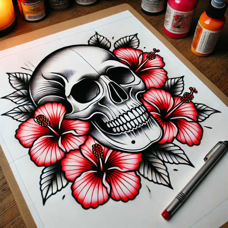 AI-generated tattoo project presenting a skull and hibiscus motif, rendered in black and grey with vibrant red blooms. The skull is carved with strong contour lines and fine cross-hatching that create a graphic, high-contrast impression, while the hibiscus flowers provide a vivid counterpoint of color and organic form. The petals are saturated red with subtle shading and crisp black outlines, and the surrounding leaves are muted grey, establishing a clear focal point on the flowers while maintaining a cohesive grayscale backdrop for the skull. The composition relies on clear silhouettes and dense linework to preserve legibility when scaled to forearm, shoulder, or back placements, making it a robust design for tattoo applications. This design blends classic tattoo vocabularies: a skull as a memento mori, hibiscus as a symbol of beauty and resilience, and the interplay between dark shading and bright color to convey depth and movement. The graphic patterning, visible in the petals, leaf venation, and skull shading, gives the piece a distinct, pattern-like rhythm that reads well in both large and small formats. As a custom tattoo design, it can be adapted to suit client preferences—adjusting color intensity, substituting the hibiscus with other flowers, or reworking the shading for black-and-grey realism. The artwork embraces the contemporary sensibilities of fine line tattoo and bold linework, yet remains rooted in tradition with strong black outlines, negative space, and careful gradient transitions. For readers seeking meaningful tattoos, the fusion of life-affirming flower symbolism with a universal skull motif offers a narrative of transformation and endurance. The presence of the red hibiscus injects vitality into the piece, while the monochrome skull provides a timeless anchor. It is suitable for those desiring a striking, eye-catching tattoo that remains versatile for various body canvases, from small designs to larger, statement pieces. In short, this is a high-contrast, pattern-rich tattoo design that merges botanical beauty with skull iconography, optimized for ink, body art, and the enduring appeal of Japanese style and traditional tattoo influences. Technique notes include deliberate line weight variation to preserve readability on curved canvases; the black-and-grey shading employs cross-hatching and soft gradients to suggest depth behind the hibiscus petals, while red inks are planned as saturated foreground accents that won’t blur with age. The design is suitable for both small tattoos and larger pieces such as sleeves or back panels, with modular elements that can be rearranged or scaled while maintaining the integrity of the composition. The motif aligns with Japanese style tattoo lineage through its strong silhouettes and controlled negative space, while the floral elements anchor it in timeless flower tattoo design traditions. Overall, this piece offers a versatile, meaningful tattoo option for clients seeking a striking, high-contrast piece with pattern-rich texture and enduring appeal.