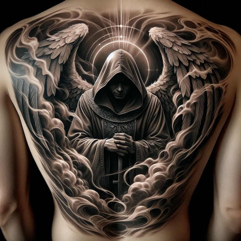 This back-piece tattoo design presents a dramatic black-and-grey composition centered on a hooded figure encircled by wings, a halo, and swirling clouds. The artist uses smooth grayscale shading, bold contrast, and soft gradients to carve the central silhouette while the surrounding vapor creates depth and motion. The hooded figure, with hands clasped before the chest, suggests quiet resolve, mystery, and a sense of solemn ritual, while the expansive wings imply protection, ascent, or transformation. The halo, rendered as a segmented circle of light, frames the head and links the earthly scene to a celestial motif, offering a visual anchor in the composition. Clouds wrap around the figure, billowing from the edges to build a layered backdrop that adds drama without overwhelming the central form. The overall design relies on strong negative space and a careful balance between densely shaded areas and lighter highlights, ensuring legibility on a broad canvas and flexibility for future expansion or color integration. As an AI-generated tattoo project, it demonstrates contemporary digital-to-ink translation, translating intricate linework and tonal variation into a scalable back-piece concept that tattoo artists can adapt. Because of its heavy darkness and defined shading, the piece is particularly well-suited for a cover-up, capable of masking prior tattoos while establishing a new narrative with clarity and impact. The style leans toward realistic black and grey, emphasizing crisp edges, smooth blend transitions, and dramatic lighting so it reproduces well on skin when scaled to a large back area. In short, this is a bold, cover-up-friendly tattoo design with graphic pattern elements, ready to be adapted to a personal story while maintaining a balance between realism and mystique.