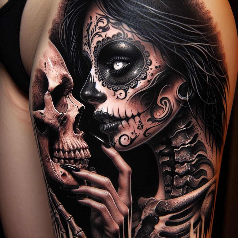 AI-generated tattoo project concept, this black and grey sugar skull portrait travels across the shoulder with a bold, cover-up-ready silhouette. The central motif blends a lifelike female face with Day of the Dead skull ornamentation, achieved through crisp linework, smooth grey washes, and ornamental filigree that curls around the eye socket and cheek. The composition preserves negative space to emphasize form, while dense shading builds volume in the skull and the neck area, giving the piece a three-dimensional, realistic tattoo effect. Visible elements include a skull juxtaposed with a sugar-skull face, a hand reaching toward the skull, flowing hair along the edge, and a stylized neck with bone-like detailing. Technique highlights contrast between pure black ink and soft grey gradients, with fine lines, dotwork accents, and lace-like patterns typical of sugar skull artistry. The theme touches mortality, transformation, and memory, making it a meaningful tattoo design choice for those seeking a dramatic cover-up. This concept demonstrates how a detailed, pattern-rich design can mask old ink with a cohesive new image while preserving personal symbolism, lending itself to a larger sleeve or shoulder piece. Influences range from traditional sugar skull motifs to modern realism, and the piece is designed to be scalable for different body contours without losing its ornate pattern. For ink history, this design aligns with fine line tattoo techniques, black and grey realism, and bold body art, offering a timeless, meaningful tattoo option with practical cover-up potential. This is an AI-generated tattoo project concept meant to illustrate how a dark, pattern-filled composition can serve as a powerful cover-up while delivering a striking, artful tattoo design.