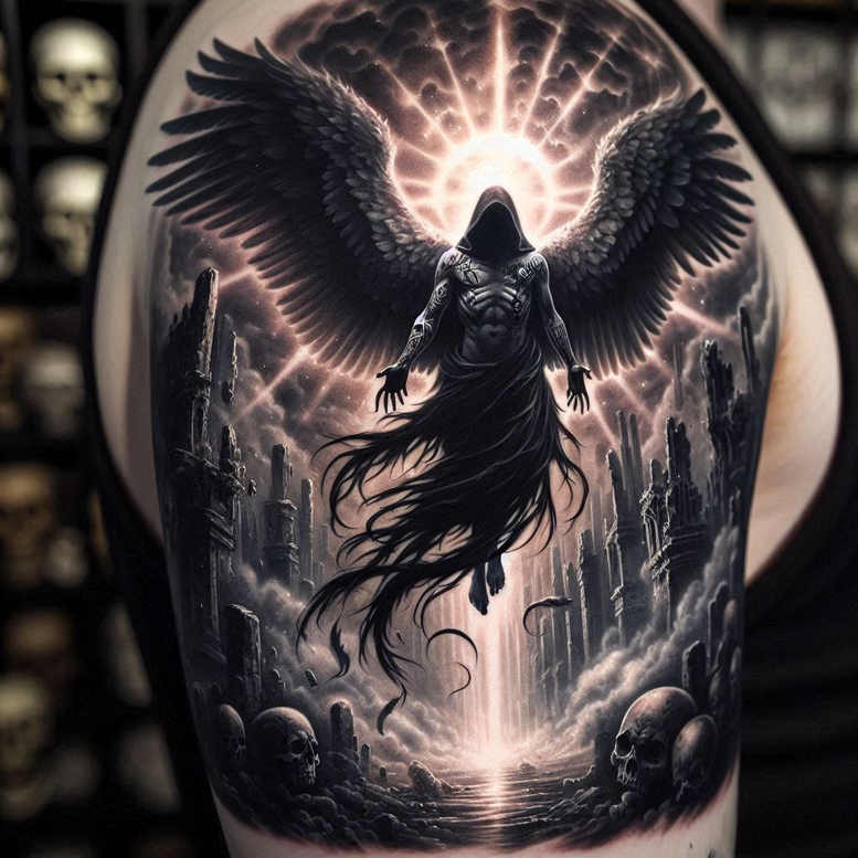 This AI-generated tattoo project concept presents a dark, monochrome scene centered on a hooded figure with expansive wings rising above a jagged, ruined cityscape. A radiant halo frames the silhouette, casting dramatic light on flowing robes and hair while skulls and broken columns anchor the composition in mortality. The piece is executed in black and grey with high-contrast realism, employing smooth gradients, bold edge work, and fine line accents to render texture—from fabric folds to bone and stone—with cinematic clarity. Symbolically, the design speaks to themes of fate, transcendence, and the cycle of life and death, making it a meaningful tattoo design for clients seeking powerful storytelling ink. The winged figure acts as a dark sentinel, suggesting resilience and transformation, while the surrounding ruins evoke a post-apocalyptic sanctuary where light pierces the gloom. The imagery sits comfortably within the language of realistic tattoo aesthetics, yet it also nods to Japanese-style shadow play and gothic fantasy through careful handling of negative space and tonal depth. Though presented as an AI-generated concept, the artwork translates well into a full tattoo project, offering flexibility for placement on the arm, back, or chest. For those pursuing bold, high-contrast body art, this concept blends classic motifs—skulls, celestial light, and architectural decay—with modern realism to create a cover-up-friendly tattoo design that remains visually arresting over time. It embraces the ink ethos of permanence and meaning, aligning with keywords like tattoo, tattoo design, meaningful tattoos, black and grey, realistic tattoo, and custom tattoo design, while inviting possibilities for further development into small or large-scale pieces. Given the intensity of darkness and the presence of skulls, this design is especially suitable as a cover-up solution for existing ink, ensuring a cohesive transformation that preserves narrative depth and visual impact.