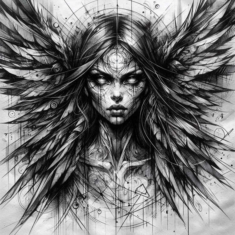 AI-generated tattoo project concept presented in a refined, black-and-grey palette, featuring a central female visage with expansive wings and a tangle of geometric line work. The piece blends fine line technique with bold negative space, with wisps of hair and the wings radiating outward in a kinetic composition. The forehead bears delicate circular motifs that echo the surrounding planarity, creating a focal point that anchors the viewer’s eye. The shading is meticulous: cross-hatching and stippling are used to model the face and the feather textures, while the wings elongate into slender, jagged quills that suggest motion and depth. The overall aesthetic nods to Japanese and Gothic influences, but remains firmly within contemporary tattoo design language, suitable for black-and-grey ink. The design reads as a narrative of transformation, with the wings symbolizing freedom and protection, and the central face conveying resolve, casting light through the surrounding shadow. For a client seeking a cover-up, this concept offers strong contrast, meticulous line work, and ample negative space to mask underlying tattoos while delivering a striking, meaningful tattoo design. From a production standpoint, the piece relies on a layered approach: a fine-line base provides the silhouette, while heavier line weights and radial lines add structure and energy. The integrated circular motifs serve as visual echoes, reinforcing the central themes of balance and duality. This tattoo idea is well-suited for those considering small to mid-size placements on the upper back, shoulder blade, or chest, though the graphic elements transpose effectively to larger canvases. The combination of black and grey ink ensures longevity and readability over time, making it a timeless body art statement, as a stand-alone piece or as a cover-up solution. In sum, this is an AI-generated tattoo project reflecting a modern interpretation of winged figures, ideal for a cover-up that preserves meaning while offering a fresh aesthetic. Keywords such as tattoo, tattoo design, meaningful tattoos, fine line tattoo, lotus flower tattoo, infinity tattoo, tribal tattoo, rose tattoo design, small tattoos, flower tattoos, custom tattoo design, Japanese style tattoo, black and grey, realistic tattoo, body art, ink are woven throughout to optimize searchability.