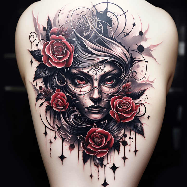 This AI-generated tattoo project presents a dramatic black-and-grey portrait intertwined with vivid red rose accents and geometric motifs. The central element is a female face rendered with high-contrast shading, its gaze intense and intimate, framed by aura-like wisps and precise fine-line details. Surrounding the visage are three crimson roses whose petals are built with smooth gradations of light and shadow to create a sculptural sense of depth on the skin. Interlacing ribbons of circular rings, star-like drops, and linear splines weave through the composition, forming a complex pattern that anchors the design to the contours of the back or shoulder. The linework balances delicate precision with bold silhouettes, allowing this piece to read as both realistic portrait and decorative body art. The predominant use of black ink, tempered by grey washes, creates moody atmosphere while ensuring timeless readability as the tattoo ages. The red rose accents provide a focal point and symbolic resonance: roses often denote love, memory, or transformation, while the face can represent resilience or mystery. The piece is crafted as a robust cover-up option, leveraging dense shading, overlapping shapes, and strategic negative space to camouflage older tattoos beneath a cohesive new image. For tattoo lovers seeking meaningful tattoos, this design delivers a narrative-rich motif—face, roses, and geometry—made for large-format work on the back or shoulder blade. As a sophisticated example of a custom tattoo design, it blends Japanese-style sensibilities of precise linework with modern black-and-grey realism and ornamental patterning. In practice, the piece is well-suited to both standalone gallery displays and as a springboard for personalized edits; AI-generated tattoo projects like this illustrate how digital planning translates into ink-ready body art, offering a precise starting point for a powerful, cover-up-capable tattoo design, with pattern elements that invite further customization and longevity in wear. Each component can be scaled, repositioned, or simplified to fit different body locations, while keeping the narrative intact. The inclusion of pattern motifs ensures that the tattoo reads clearly from a distance and remains legible in black and grey, even as the skin ages. For readers of ink magazines, this description emphasizes the craft, technique, and symbolic depth—an ideal template for meaningful tattoos, including small tattoos in tighter spaces, but also offering a dramatic option for larger canvases.