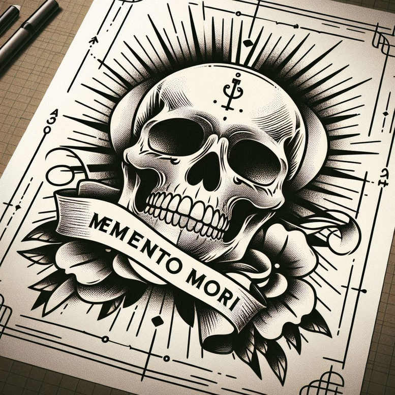 AI-generated tattoo project presents a bold black-and-grey skull motif centered on a banner that proclaims MEMENTO MORI. The design is framed by a geometric halo of radiating lines and sunburst accents, with curling leaves beneath the skull that add a natural counterpoint to the stark ink. Heavy outlines and dense black shading define the cranium, eye sockets, nasal cavity, and teeth, while stippling and cross-hatching provide depth and texture in the shadows. The banner wraps across the lower face, carrying the Latin reminder of mortality, a timeless theme that makes this a meaningful tattoo design for anyone reflecting on life, time, and memory. The composition plays with symmetry and negative space to deliver high visual impact on larger canvases such as the upper arm, back, shoulder, or chest, and it stands as a strong candidate for a cover-up where older ink can be masked by bold black areas and solid lines. The piece nods to traditional skull motifs while embracing modern line work and pattern-rich shading; it reads clearly from a distance and rewards closer inspection with textured detail. This AI-generated concept is a tattoo project that can be resized and repositioned without losing clarity, offering a professional, adaptable design suitable for custom tattoo design work. SEO-forward keywords weave into the narrative: tattoo, tattoo design, meaningful tattoos, black and grey, fine line tattoo, rose tattoo design, small tattoos, flower tattoos, custom tattoo design, realistic tattoo, body art, ink, and Japanese- and tribal-inspired influences. For clients considering a cover-up, the dense blacks and bold outlines provide effective ink concealment while preserving a timeless graphic statement. The origin as an AI-generated tattoo project is acknowledged, reflecting contemporary approaches to tattoo ideation while delivering a design with classic appeal.