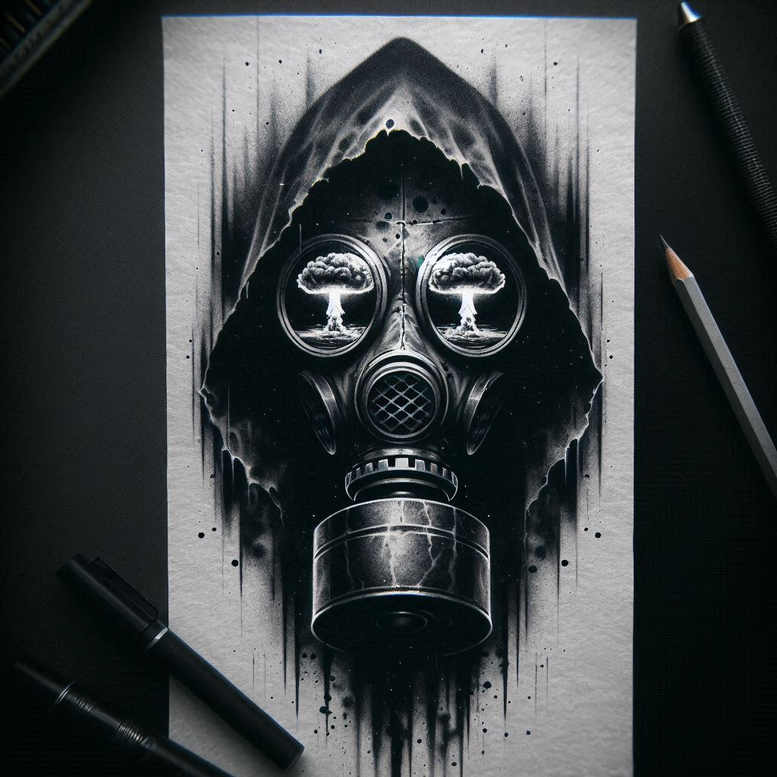 This concept presents a bold, cover-up ready gas mask hood tattoo design rendered in black and grey realism. The central image is a hooded silhouette that frames a vintage respirator, the lenses reflecting stylized mushroom clouds to evoke themes of containment, danger, and rebirth. The piece relies on smooth gradient shading, high-contrast black tones, and fine line texture to create a tangible metallic surface on the mask and a soft fabric fall of the hood. The surrounding ink splatters and dripping edges enhance the sense of motion and decay, while negative space around the mask anchors the composition as a striking standalone tattoo or a seamless cover-up over previous work. The two circular lenses act as windows into a symbolic world where conflict, memory, and resilience intersect; the respirator grid adds an industrial motif that complements a modern or Japanese-inspired approach to body art. The overall design emphasizes precision in line weight and shading, blending realistic tattoo techniques with graphic, pattern-like elements that can adapt to various body contours. The composition allows for bold silhouettes on trunk or arm placements, while offering depth through subtle shading in the filter guard and hood creases. The choice of black and grey reinforces a timeless mood; the image can be scaled from small wards to large back pieces and can be detailed with micro-drips or extended pattern work for a cohesive cover-up. For those seeking a dramatic cover-up, the dense black fields and contrast allow light areas to be reworked or integrated with existing ink, and the large mask provides ample space for future embellishments. This is an AI-generated tattoo project concept, illustrating how a gas mask motif can be rendered with depth, texture, and symbolic weight.