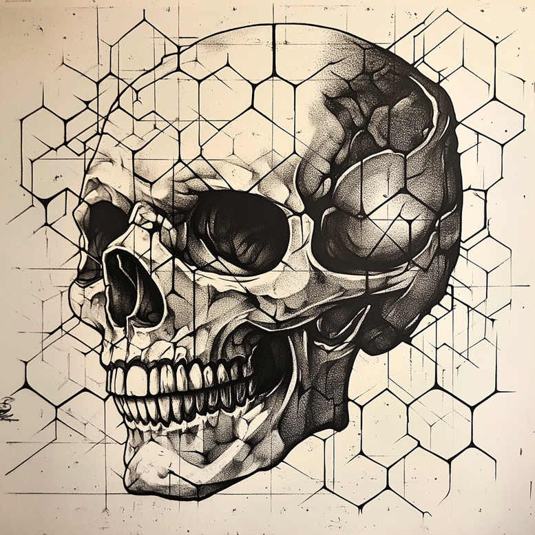 This AI-generated tattoo project presents a cover-up ready skull composition, combining a detailed human skull rendered in black and grey with a bold hexagon lattice that dissolves into the surrounding space. The result leverages fine line emphasis and stippled shading to create dimensionality across the cranium, jaw, and teeth, while the geometric hex pattern forms a dynamic backdrop that adds texture without overpowering the central image. The work reads as a modern fusion of anatomical realism and abstract geometry, a design choice that suits larger skin canvases and discusses themes of mortality and structure through line weight and negative space. The skull’s contours are carved with careful crosshatching and micro-dots to suggest bone density, while the hexagonal grid appears to drift behind and around the bone, echoing a tiled, almost architectural pattern. The composition works well as a cover-up because it merges strong, solid black areas with intricate line work that can be extended or adjusted to mask existing tattoos beneath; the background hexes offer built-in opportunities to blend edges and fill gaps. For ink technique, the piece leans into black and grey realism with emphasis on contrast, shading, and precision lines—ideal for a refined, lasting impression in a highly visible location. Symbolically, the skull evokes mortality and resilience, while the hexagon motif conveys order, unity, and interconnectedness, offering meaningful tattoos that can be read as a personal mandala of life experiences. This is an AI-generated tattoo project intended for professional interpretation, and its cover-up readiness ensures suitability for concealing previous designs with a bold, contemporary look. The design can be adapted to different skin tones, sizes, and placements, maintaining balance between the anatomical focal point and the geometric field; it also stands as a strong example of how graphic patterns can be integrated into traditional motifs to create a striking, timeless tattoo. In summary, this tattoo design pairs a realistic skull form with a hexagon pattern and black-and-grey shading to deliver a compelling, cover-up-ready statement piece that remains flexible for future customization, while leveraging the precision and texture available through AI-assisted concepting.