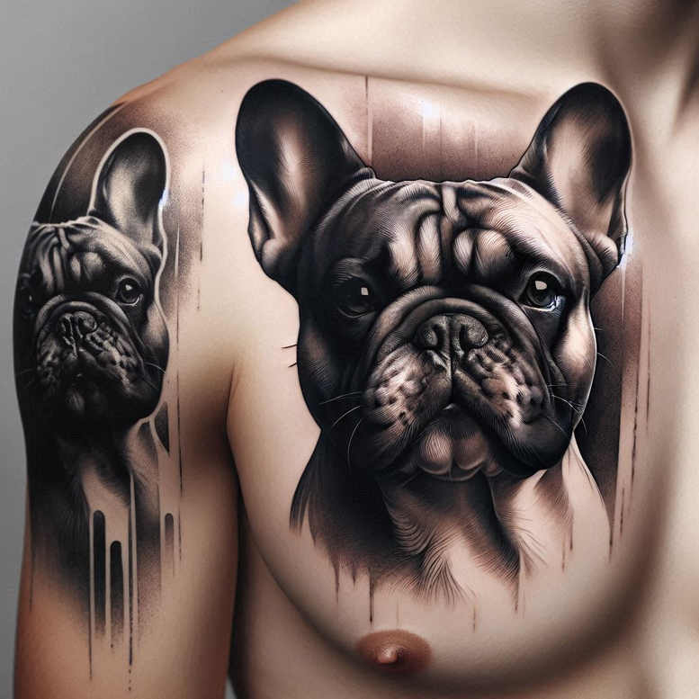 This AI-generated tattoo project explores a dramatic black and grey realism composition across the chest and shoulder, featuring two French bulldogs as the focal subjects. The larger bulldog sits prominently on the chest with a lifelike muzzle, expressive eyes, and detailed fur texture achieved through controlled cross-hatching and smooth gradient shading. A secondary bulldog peeks from the shoulder, creating a strong diagonal flow that unifies the upper torso into a cohesive scene. The piece employs deep blacks and nuanced grey washes to build depth, contrast, and volume, yielding a highly realistic rendering of fur, wrinkles, and skin tone. Surrounding elements take a graphic turn: vertical drip motifs frame the dogs, adding rhythm and a contemporary edge while subtly evoking a paint-drip pattern that enhances visual movement without overpowering the portrait. The drips also offer practical considerations for clients seeking a potential cover-up, as the bold shading can effectively obscure previous ink when extended or integrated. This concept is AI-generated tattoo project material, reflecting a modern approach to custom tattoo design where photorealistic animal portraits meet graphic accents and adaptive placement. Symbolically, bulldogs convey loyalty, tenacity, and companionship, making the design meaningful for dog lovers and collectors of medium-sized pieces. From a technical perspective, the piece leverages black and grey realism, precise line work for whiskers and fur texture, and carefully layered shading to achieve a lifelike gaze and tactile fur. The composition is adaptable to the chest, shoulder, or clavicle, preserving balance between the heads while leaving room for future embellishments if desired. Keywords to associate with this design include tattoo, tattoo design, meaningful tattoos, fine line tattoo, lotus flower tattoo, infinity tattoo, tribal tattoo, rose tattoo design, small tattoos, flower tattoos, custom tattoo design, Japanese style tattoo, black and grey, realistic tattoo, body art, ink.