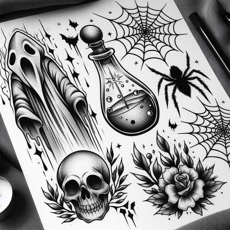 AI-generated tattoo project concept presented here features a dense black and grey composition designed to work as a cover-up while delivering graphic clarity. The primary motifs include a skull with precise shading that anchors a shrouded cloak, a glass potion bottle with bubbles, a blooming rose, and spiderwebs that radiate from the edges, all rendered in crisp fine line work. The composition uses strong negative space and high-contrast ink to create a timeless, dramatic look that scales from small placements to larger sleeves. The skull anchors the piece with realistic anatomy and subtle gradient shading, while the cloaked figure evokes mystery and contemplation. The potion bottle adds an alchemical touch, suggesting transformation or healing, and the rose offers a counterpoint of beauty and mortality. The webs function as a definitive pattern element, connecting motifs and guiding the eye across the design. Technically, the artist employs traditional black and grey shading, stippling, and clean outlines to render the skull, bottle bulges, and web motifs with a cohesive gothic mood while keeping the piece readable on skin. Although rooted in gothic and occult aesthetics, the design remains adaptable for standalone tattoos, small pieces, or sleeve work, reflecting current trends toward meaningful tattoos and custom tattoo design. For clients seeking a cover-up, the dense black shading and bold lines are crafted to mask underlying ink while preserving the new imagery’s legibility and impact. The tattoo design also embraces a clean, modern aesthetic that appeals to fans of fine line tattoo and black and grey realism, with potential variants that echo lotus flower tattoo or infinity tattoo motifs if desired. This AI-generated tattoo project demonstrates how digital concepting can translate into strong, ink-ready outlines for studio artists, offering a versatile template that blends pattern, symbolism, and technical precision for durable body art. Keywords include tattoo, tattoo design, meaningful tattoos, fine line tattoo, rose tattoo design, black and grey, realistic tattoo, custom tattoo design, spiderweb pattern, flower tattoos, and ink.