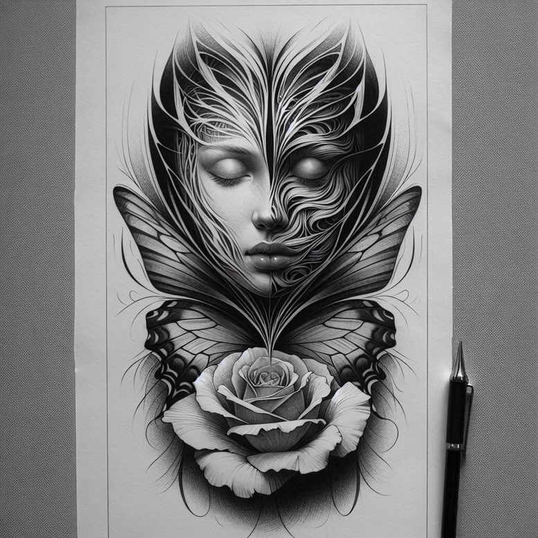 Rendered in black and grey, this design merges portraiture with organic motifs into a cohesive tattoo composition. The focal point is a serene female face, rendered with fine line technique and soft shading that convey calm presence. From the temples, butterfly wings unfold in a lace-like pattern, their intricate lines creating a delicate halo that frames the features and extends outward with motion. A large rose anchors the lower portion, its petals built with gradients and cross-hatching to impart depth while maintaining linear clarity. The overall effect is dramatic and pattern-rich, balancing realism with graphic ornament. The contrast between densely inked areas and clean negative space ensures strong readability on the skin from near or far. Symbolically, the face suggests identity and inner beauty, the butterfly signifies metamorphosis and resilience, and the rose embodies love, growth, and renewal. The composition nods to Japanese-style line work through precision, symmetry, and natural motifs, while remaining a contemporary black and grey tattoo design suitable for modern body art. As an AI-generated tattoo project, it offers a glimpse into how algorithm-driven design can inspire meaningful tattoos while preserving artisanal nuance. Its bold contrasts and refined motifs make it a compelling option for a cover-up or a stand-alone statement piece on the forearm, chest, or back. The piece is adaptable to small or larger scales and can be reimagined as a lotus flower tattoo or other floral motifs, keeping the core silhouette intact for a personalized ink story. Detailed line work renders feathered wings and petal textures with care, and the balance of light and shadow creates a timeless aesthetic. The design can be oriented vertically to accentuate the body’s contours, making it suitable for placements like the collarbone line or the sternum, and it remains a versatile template for future explorations of flower tattoos, butterfly motifs, and portraiture in black and grey ink.